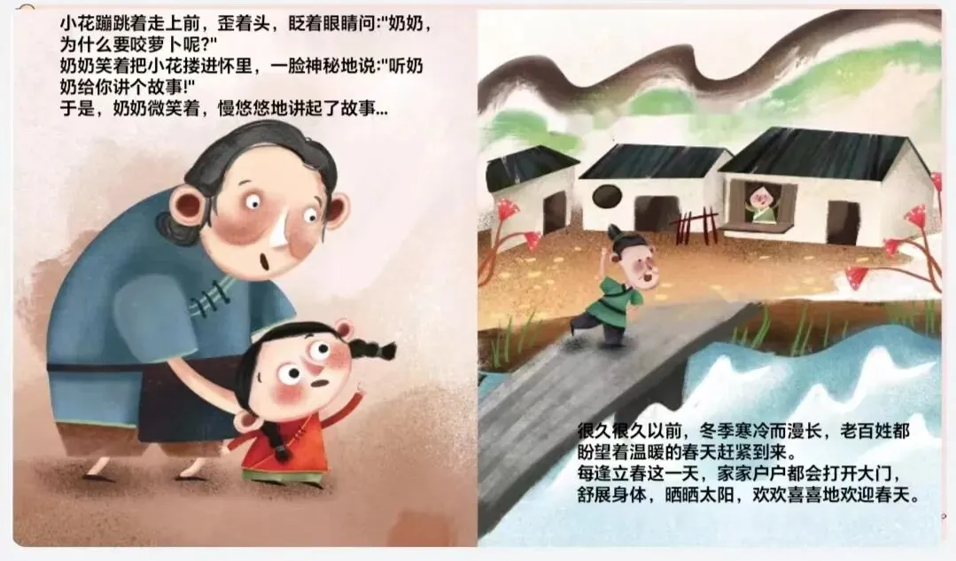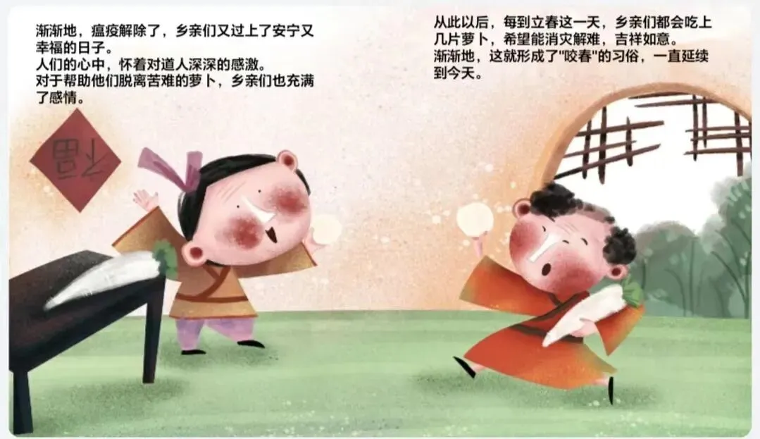 讲述了一个古老的传说。在古代,立春前夕瘟疫降临村庄,一位道人向神仙求得消除瘟疫的方法,让村民在立春这天吃萝卜,最终瘟疫解除。从此,立春“咬春”的习俗流传下来,人们通过吃萝卜、春饼、春卷等食物,祈求消灾解难、吉祥如意。