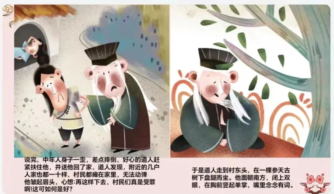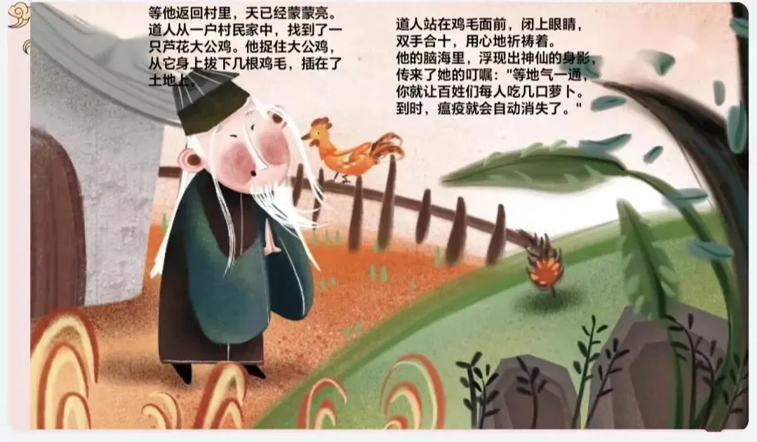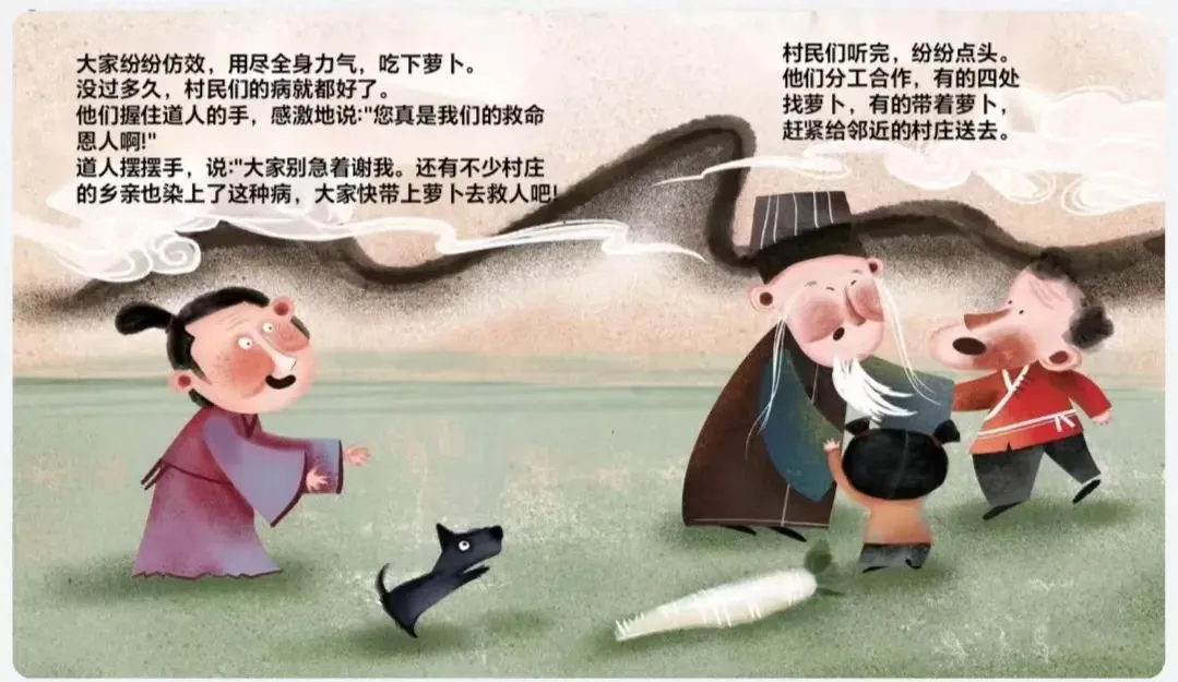 道人摆摆手,说∶"大家别急着谢我。还有不少村庄的乡亲也染上了这种病,大家快带上萝卜去救人吧!
