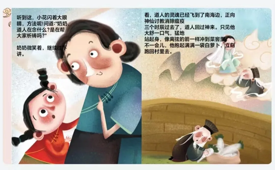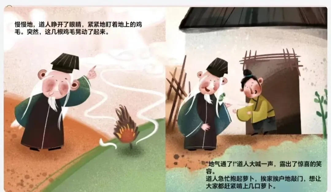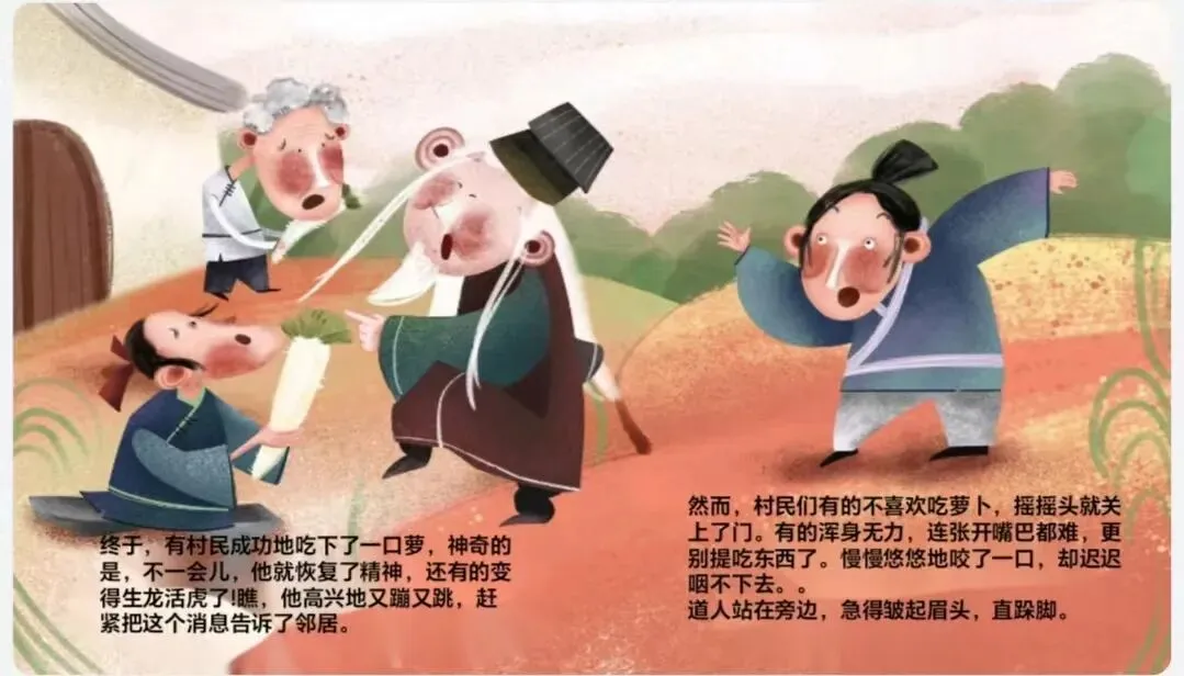 道人急忙抱起萝卜,挨家挨户地敲门,想让大家都赶紧啃上几口萝卜。
