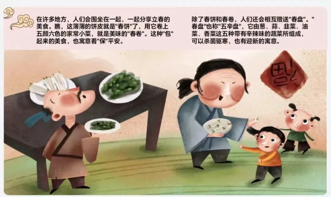 在许多地方,人们会围坐在一起,一起分享立春的美食。瞧,这薄薄的饼皮就是"春饼"了,用它卷上五颜六色的家常小菜,就是美味的"春卷"。这种"包"起来的美食,也寓意着"保"平安。