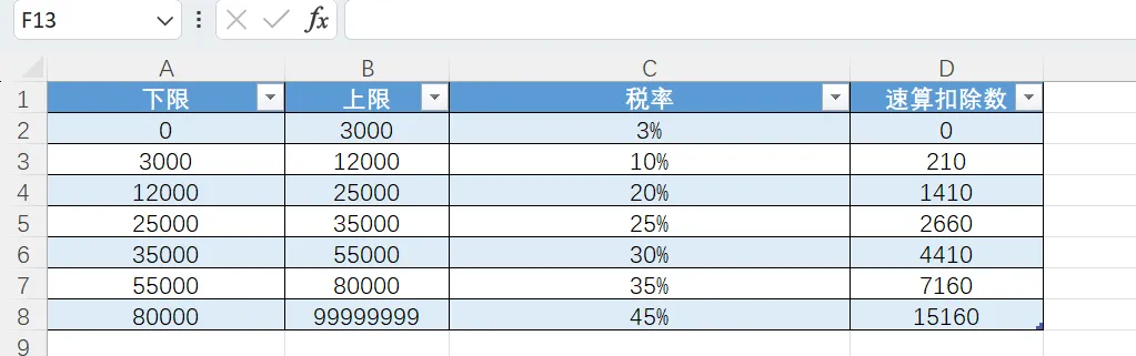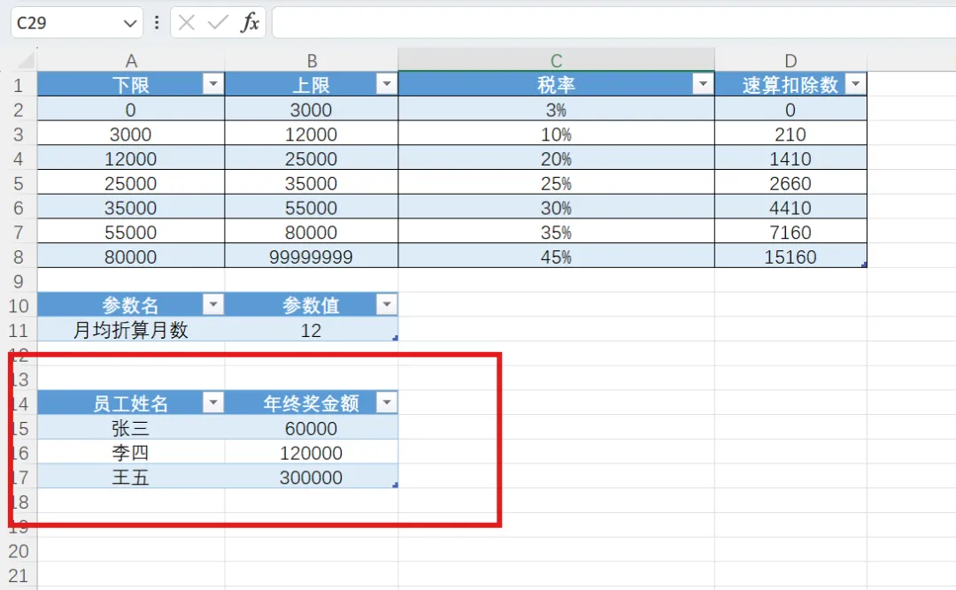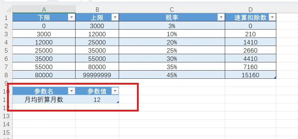 1. 年终奖单独计税税率表,选中表后按ctrl+T,存储表名为tblBonusRate,后面计算用得到