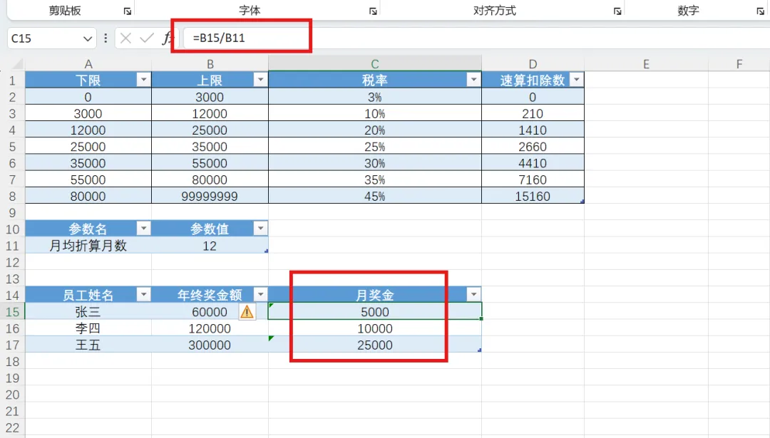 输入区域,c列新增月奖金列,月奖金=年终奖÷月均折算月数,如果未未来政策调整,只需要修改月均折算月数的值,也就是B11的值在输入区域,D列输入列名“税率”,在D15输入公式:=XLOOKUP(C15, tblBonusRate[下限], tblBonusRate[税率], , -1)