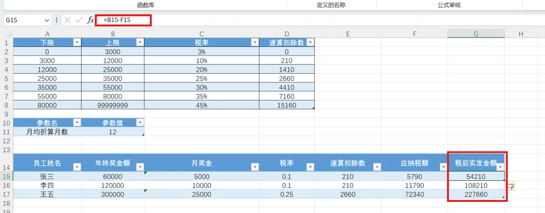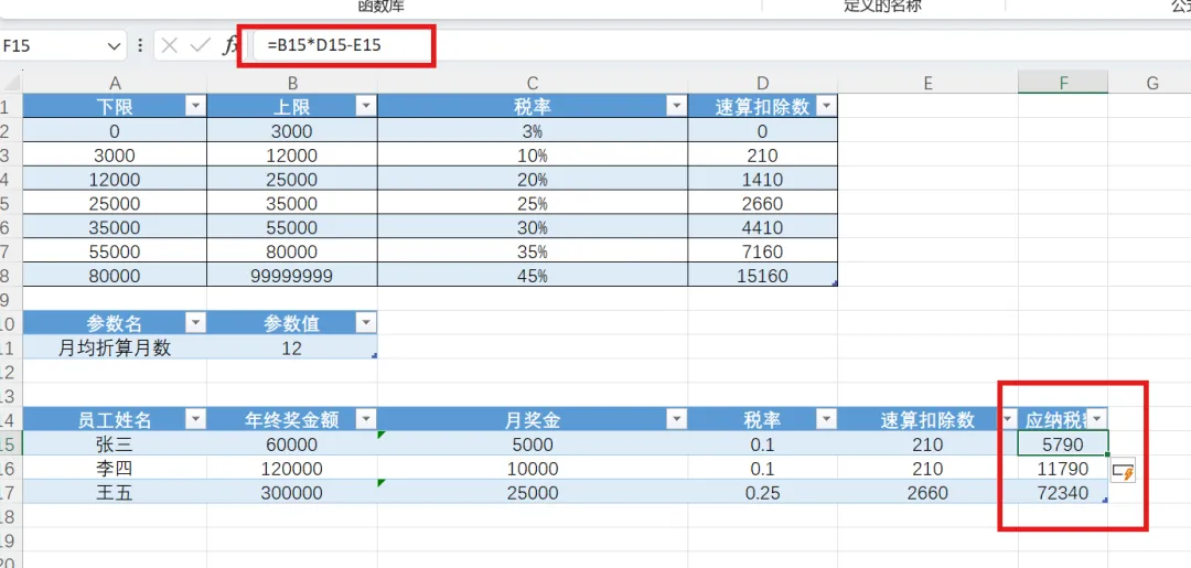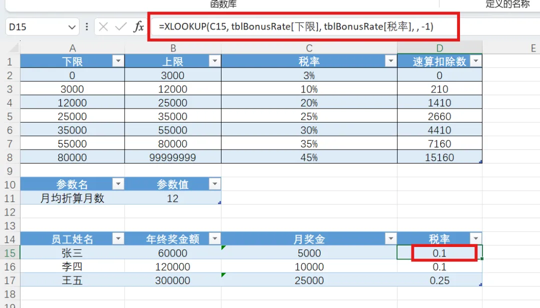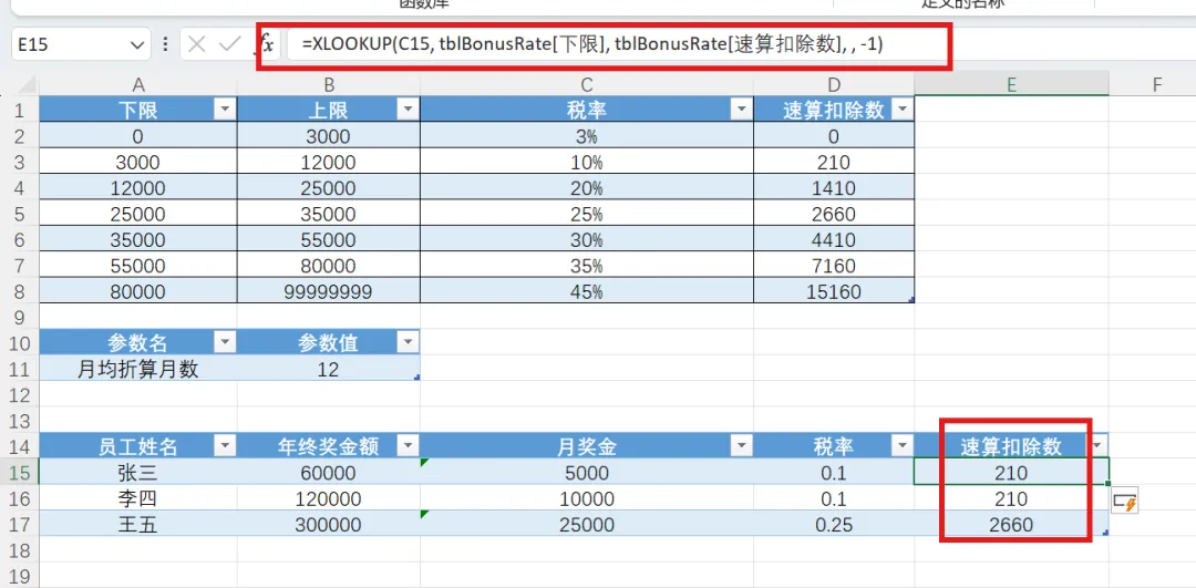 然后,输入区域E列,命名“速算扣除数”,在D15输入公式=XLOOKUP(C15, tblBonusRate[下限], tblBonusRate[速算扣除数], , -1)