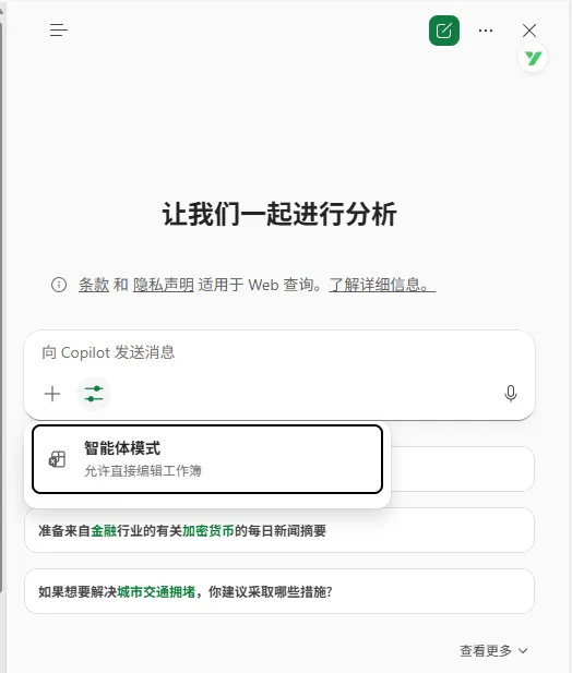 Agent 模式现在覆盖 Excel 网页版、Windows 桌面版、Mac 桌面版,并且直接集成在 Excel 的 Copilot 里。微软也表示未来几周到几个月会继续优化体验。