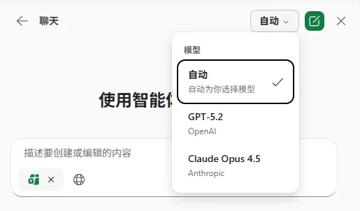 你也可以在运行提示词前 手动指定模型目前可用的包括:OpenAI 的 GPT 5.2 与 Anthropic 的 Claude Opus 4.5(面向 Microsoft 365 商业版Copilot 与 Microsoft 365 个人高级版许可)。