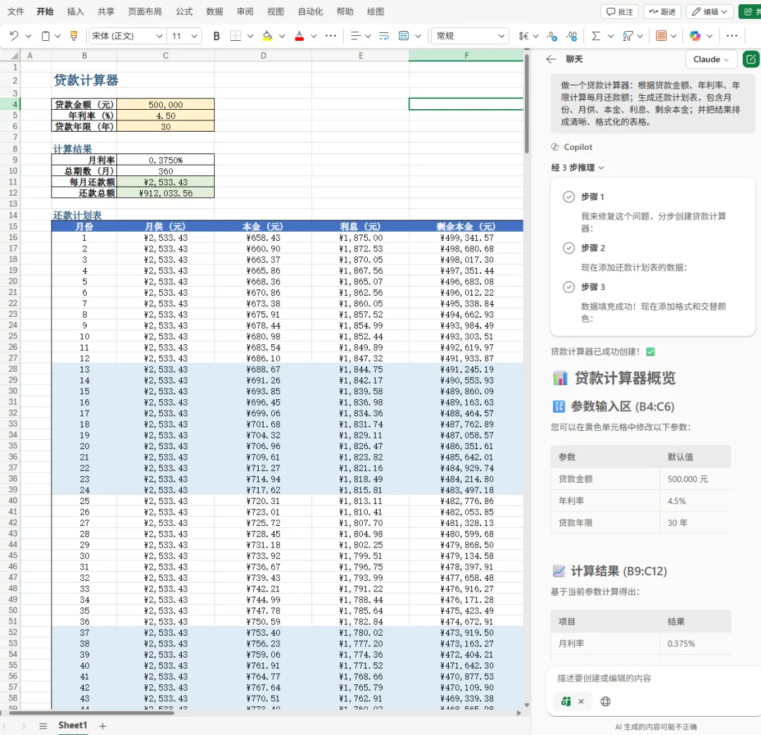 “做一个贷款计算器:根据贷款金额、年利率、年限计算每月还款额;生成还款计划表,包含月份、月供、本金、利息、剩余本金;并把结果排成清晰、格式化的表格。”