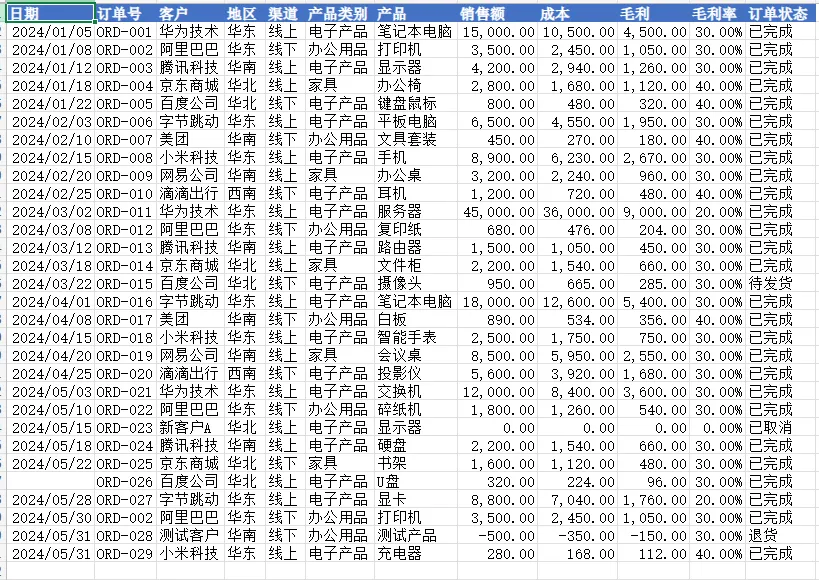 新建或整理一张明细表(命名为“Sales_Raw”),字段包含:日期、订单号、客户、地区、渠道、产品类别、产品、销售额、成本、毛利、毛利率、订单状态。若缺少字段,请新增并给出合理的默认/空值处理方式。