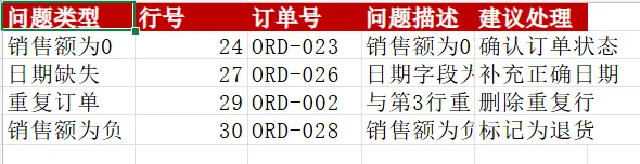 检查数据质量:去重(按订单号)、识别空值/异常值(销售额为 0、负数、日期缺失),并在“Data_Check”表输出问题清单(问题类型、行号、订单号、建议处理)。
