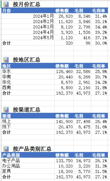 生成汇总结果:按月份、地区、渠道、产品类别分别汇总销售额、毛利、毛利率,并创建数据透视表(命名为“Pivot_Summary”)。