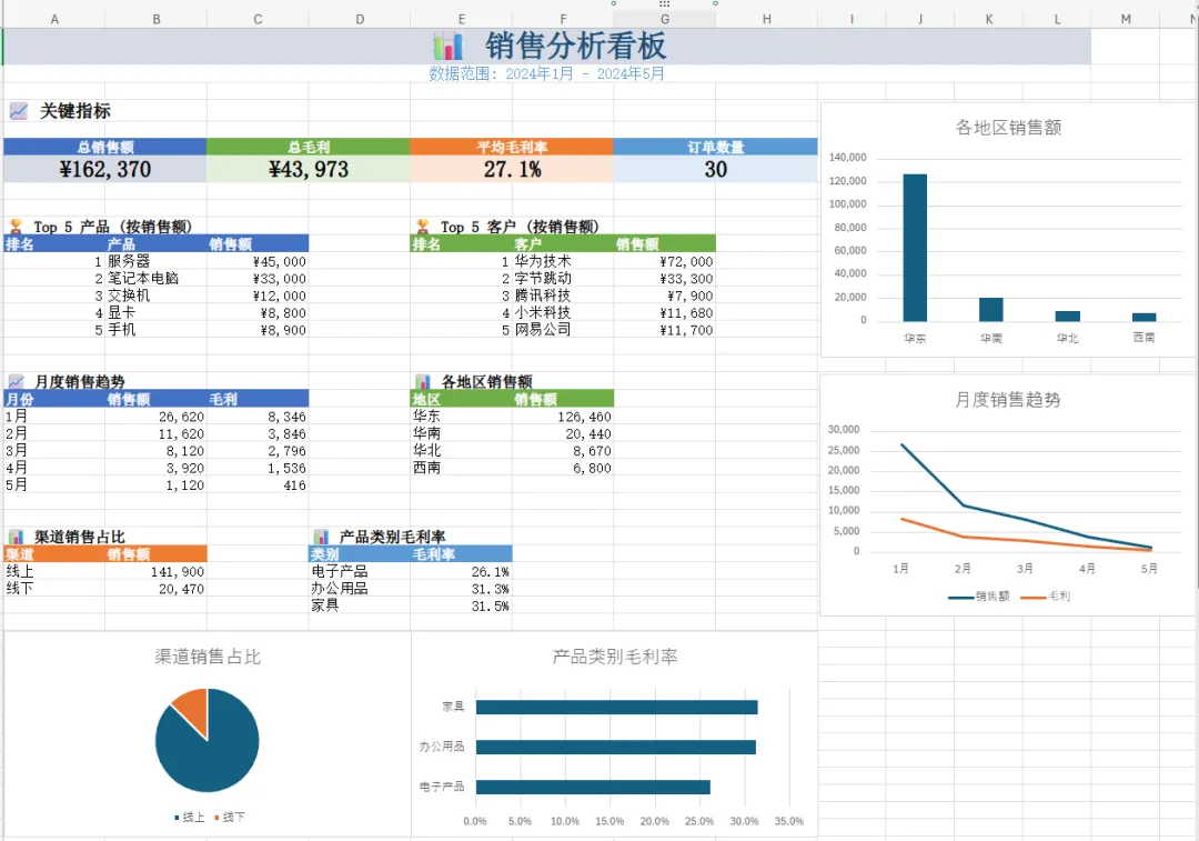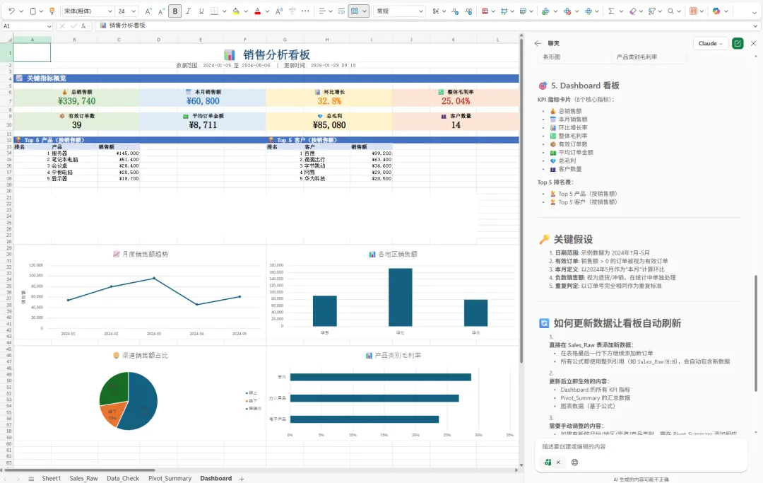 输出一个“Dashboard”工作表,将上述关键指标(本月销售额、环比、毛利率、Top 5 产品/客户)和图表排版成一页可汇报的看板,格式清晰、对齐美观,并加上标题与日期范围。