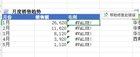 里面还有个小插曲,自动生成的透视表出现了错误,点击错误单元格,右上角会出现“帮助修复此错误”按钮: