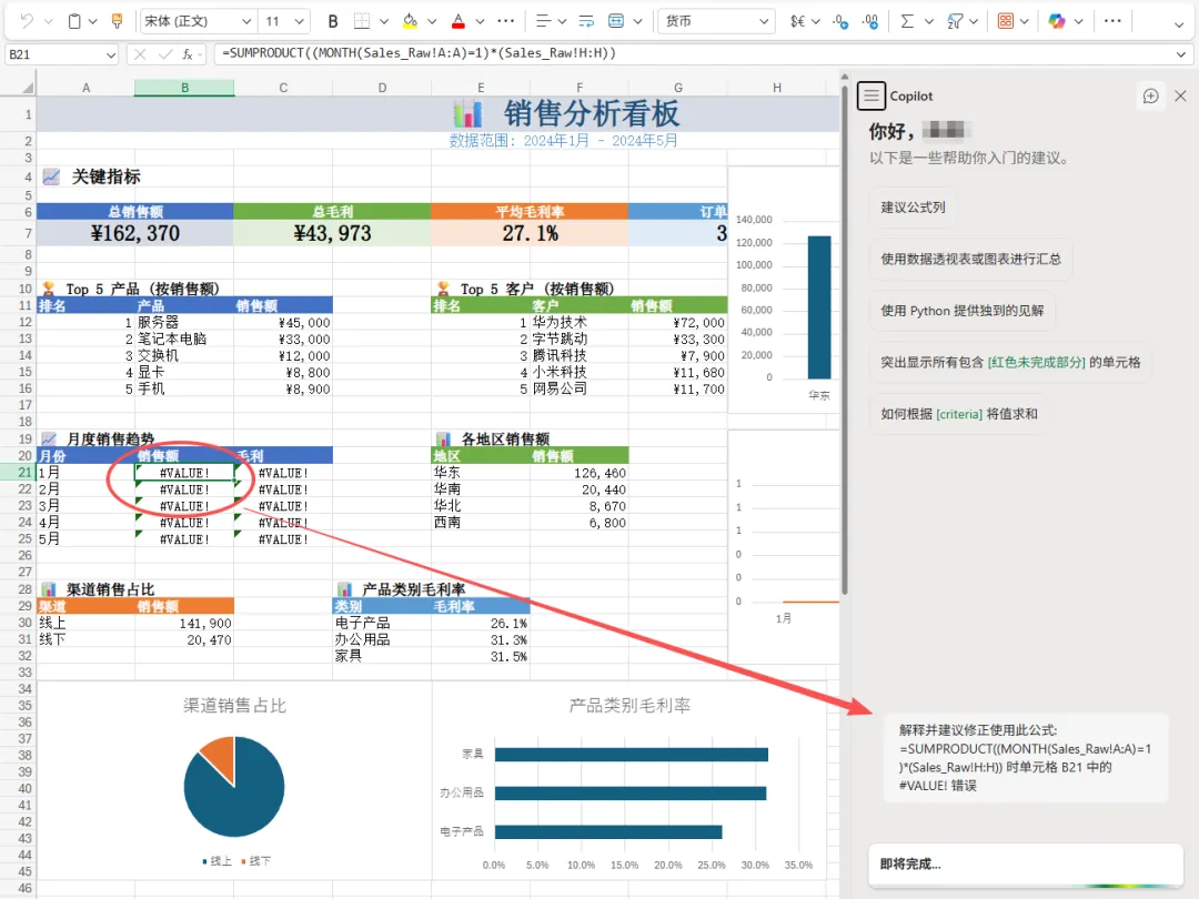 点击后,copilot会帮助你分析错误原因,给出准确公式,并自动修复这个错误: