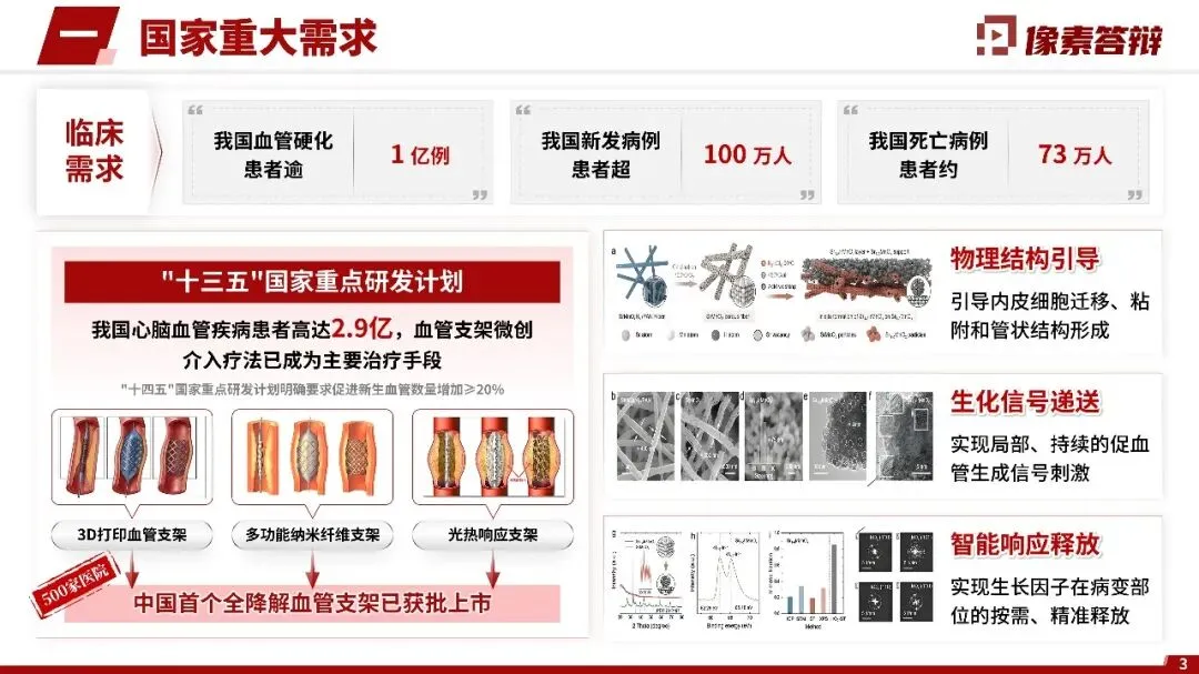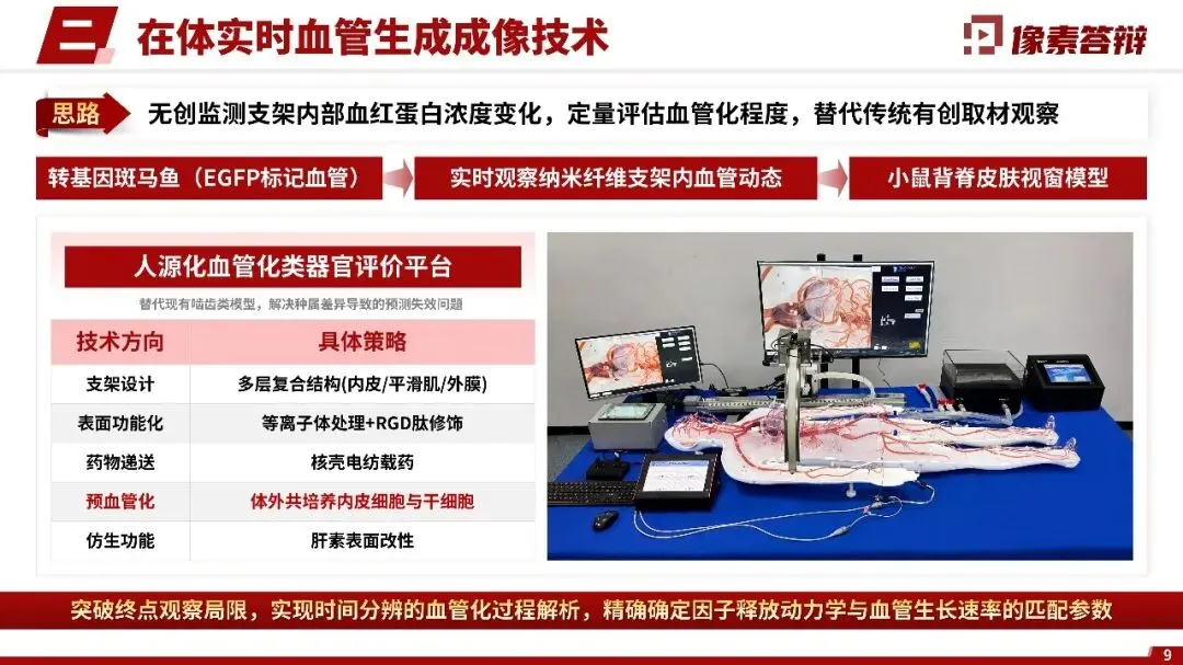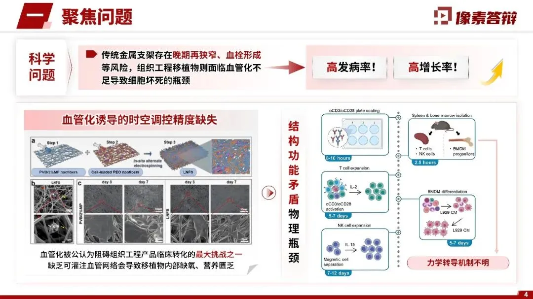 采用简约学术风,统一16:9版式与模板(标题栏、页脚固定);字体、配色庄重规范(少用花哨元素);复杂原理(如血管化诱导机制)用示意图/流程图简化,数据以图表呈现,提升可读性。