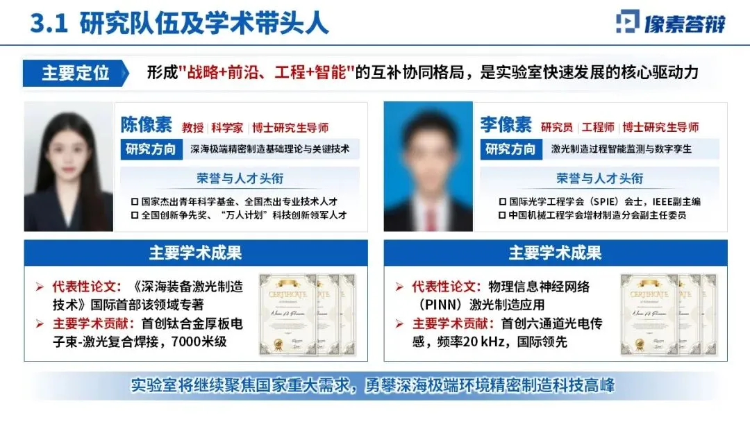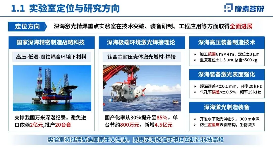 聚焦国家深海精密制造战略需求,主攻深海极端环境激光焊接理论、高压装备制造等核心方向,关键装备国产化率提升至 85%,精度达国际先进水平。组建 350 人固定团队,国家级人才超 40 人,形成多领域专家互补格局,主导多项国际、国家标准制定,支撑 5 项国家级重大工程。