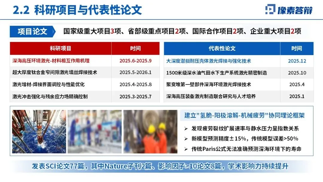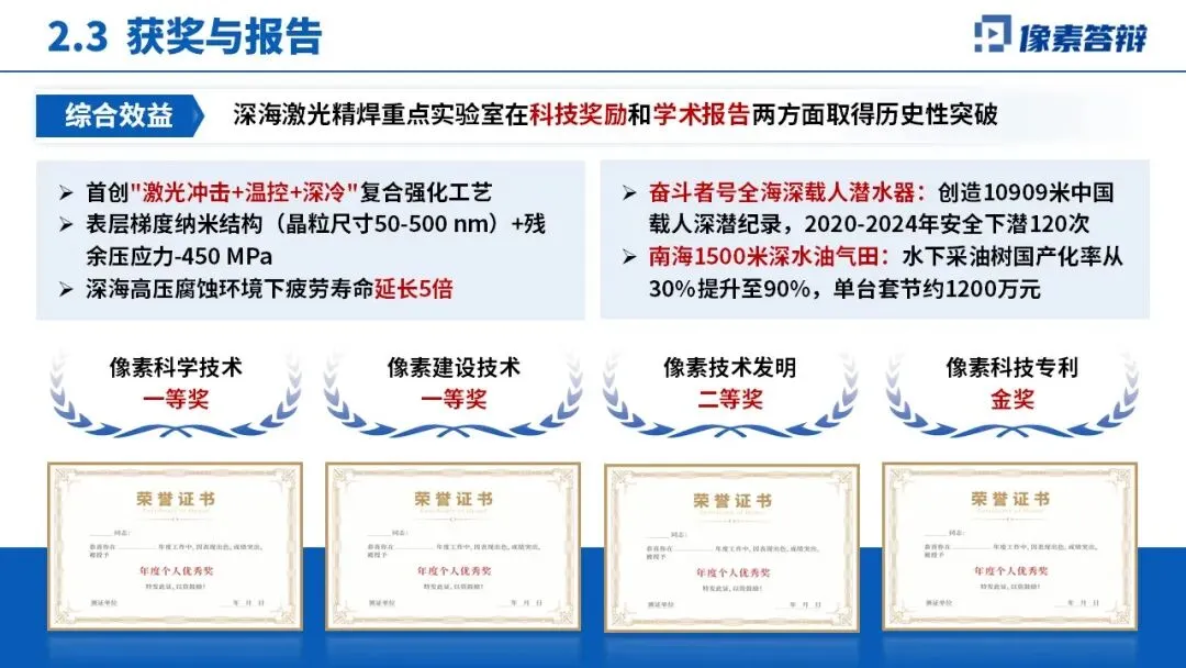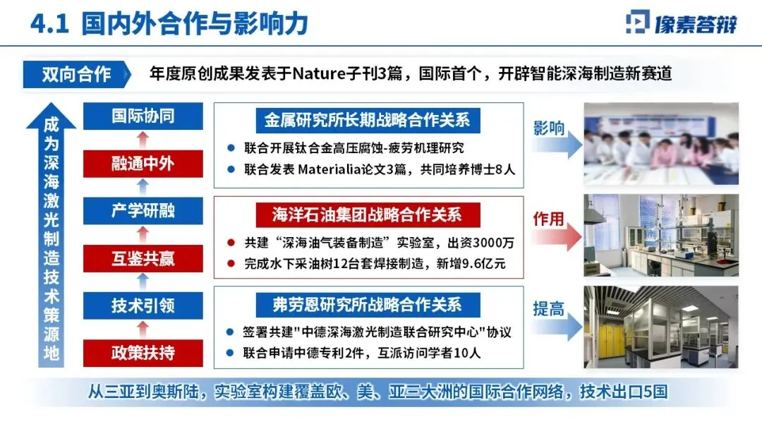 科研上获批多类国家级、国际合作项目,发表 SCI 论文 77 篇(含 Nature 子刊 2 篇),首创多项核心技术,获多项科技奖励;应用上助力 “奋斗者” 号、南海油气田等重大工程,直接经济效益 8.5 亿元,带动产业规模 61.6 亿元,技术出口 5 国创汇 3200 万欧元。与国内外科研机构、企业共建联合实验室,构建全球合作网络,提升行业话语权。