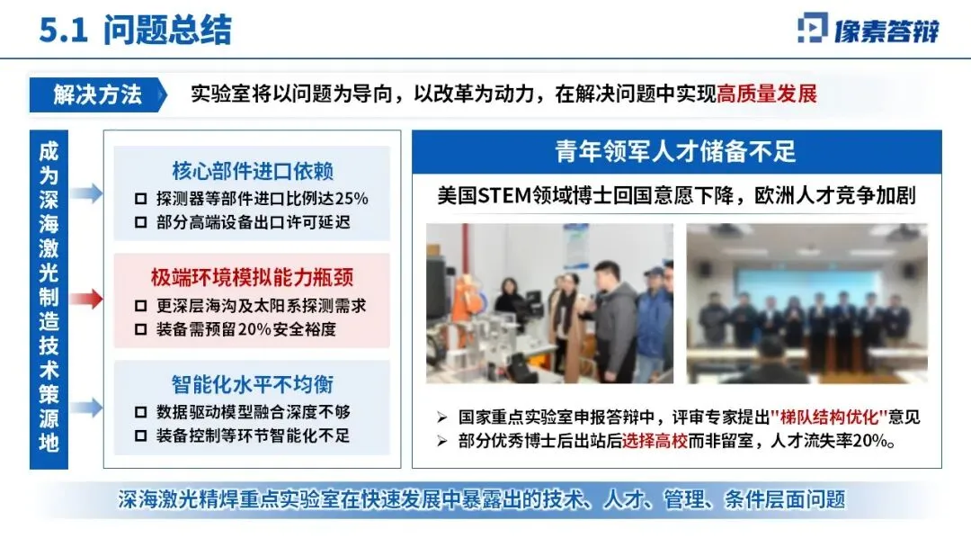 当前存在核心部件进口依赖、青年领军人才储备不足、极端环境模拟能力有限等问题。未来将推进体制机制改革,攻关智能涌现制造等前沿技术,承担 “深海空间站” 等重大工程,建成世界一流研究基地,助力海洋强国、制造强国建设。