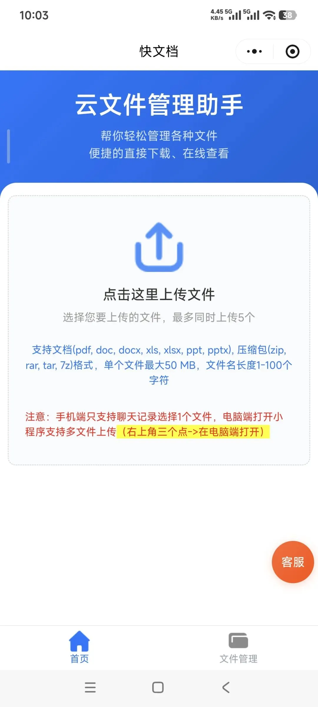 在微信中搜索并打开“快文档”小程序,点击“上传文件”按钮。系统支持Word、Excel、PPT、PDF、WPS、TXT,甚至ZIP/RAR压缩包和MP3音频等多种格式。单个文件大小需控制在50M以内。
