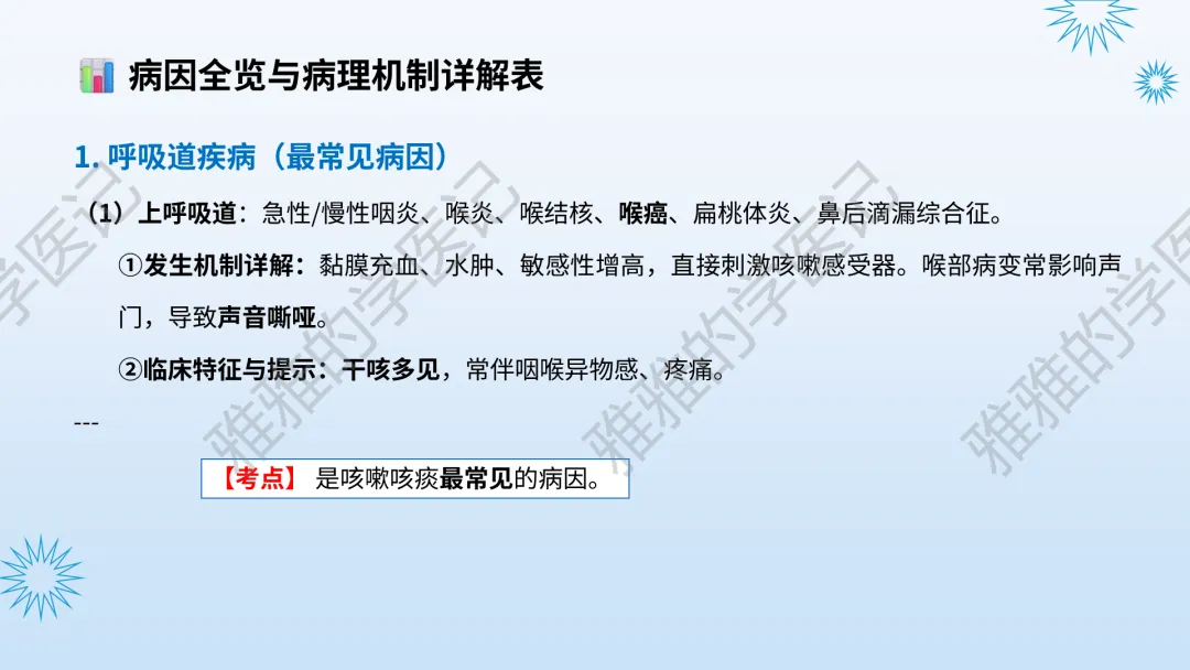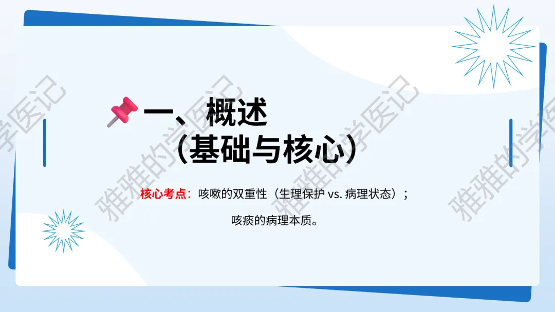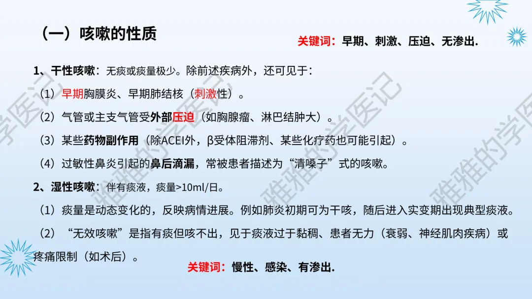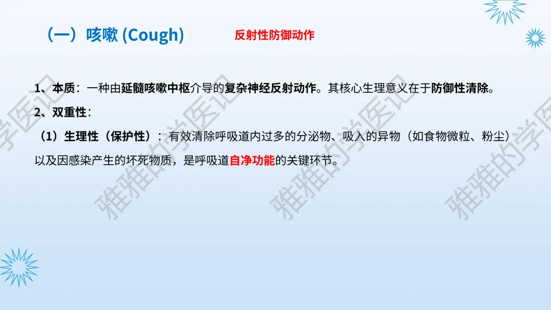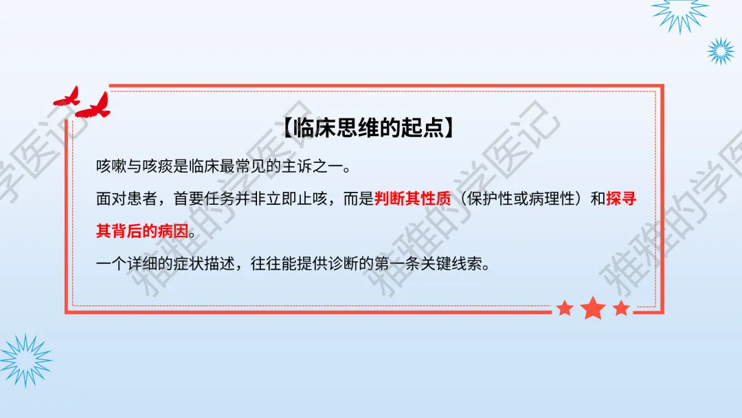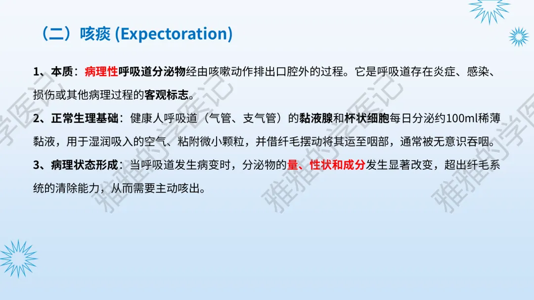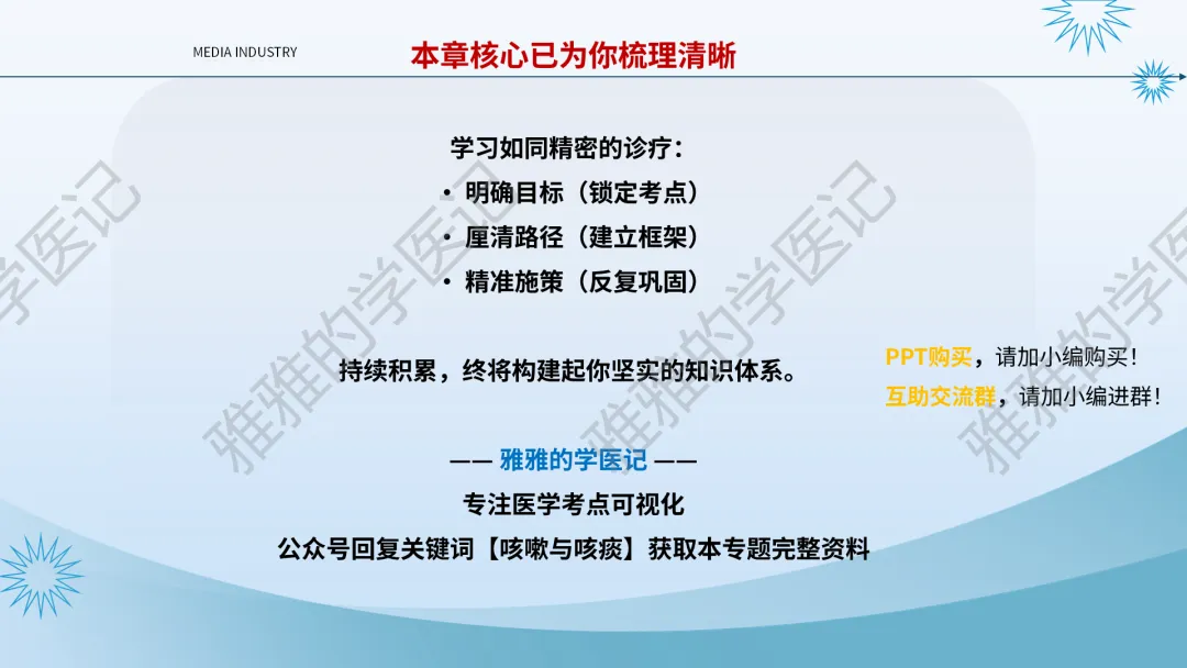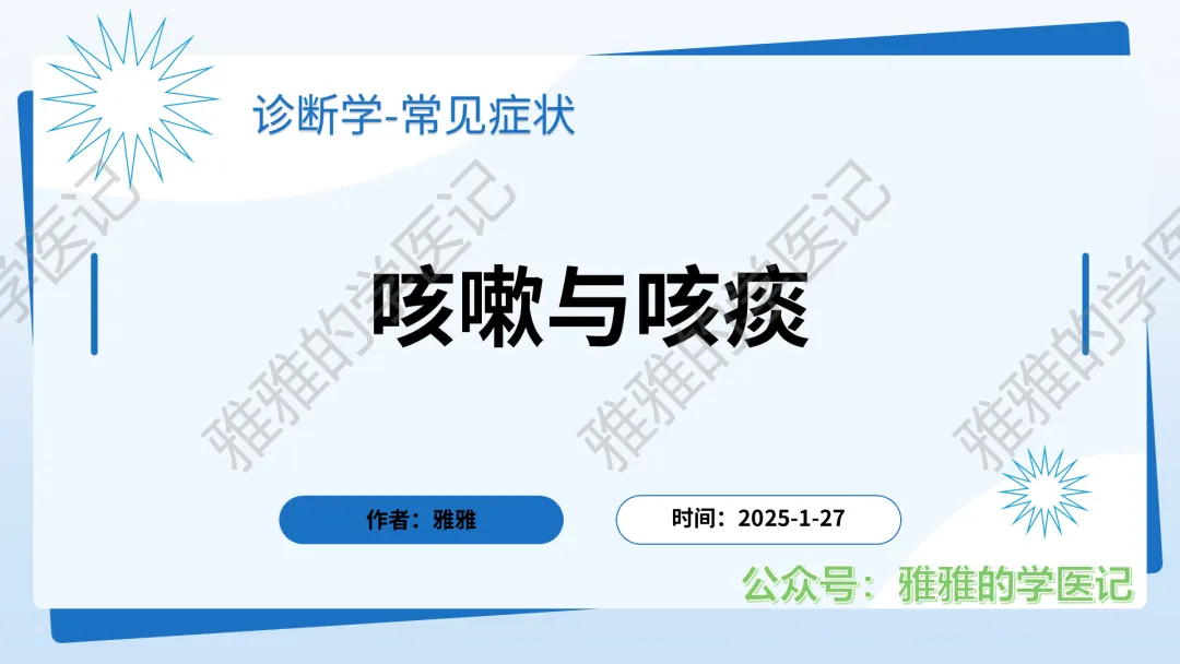 本PPT内容引用自《内科学(人卫第9、10版)》等权威文献,PPT版权归本公众号所有,制作与审稿均由本公众号完成。关注公众号为“雅雅的学医记”,获取更多专业健康知识。这份PPT凝聚了专业知识与临床经验,对咳嗽与咳痰具有认识,并了解学习的意义,欢迎大家分享转发,共同学习,期待与大家的互动!目前学识有限,欢迎大家的指正。内容说明:咳嗽与咳痰,制作完成,目前正在更新,需要笔记版请联系雅雅(免费)。后续更新内容:肺炎支原体肺炎、衣原体肺炎与肺军团病。- 知识点,需要不断积累,并梳理整理为自己的。加油!书山有路勤为径,学海无涯苦作舟。(韩愈)