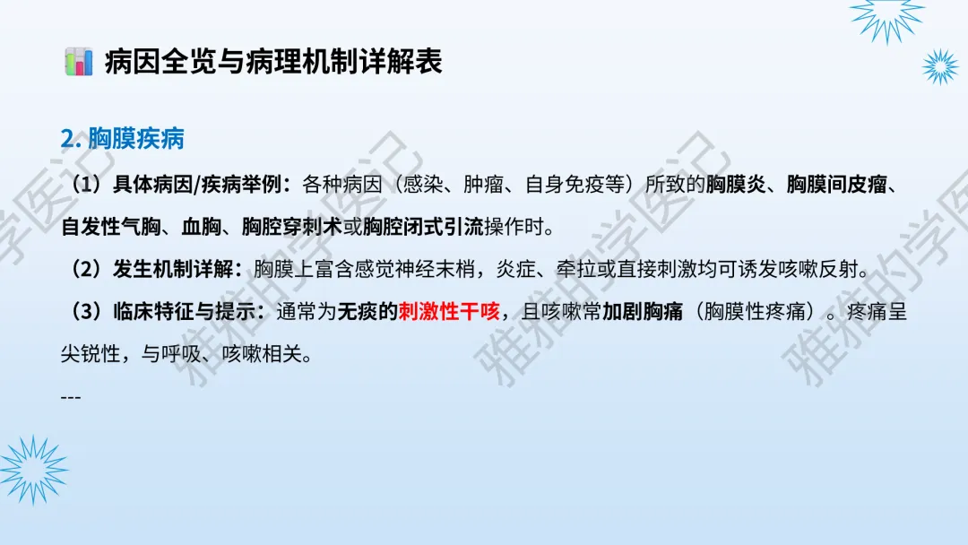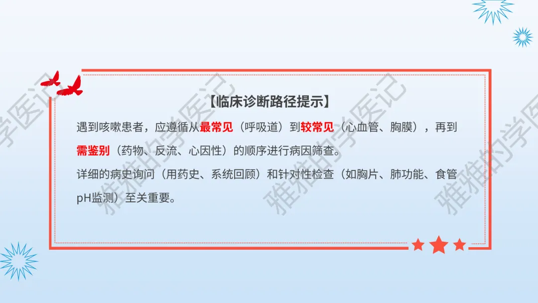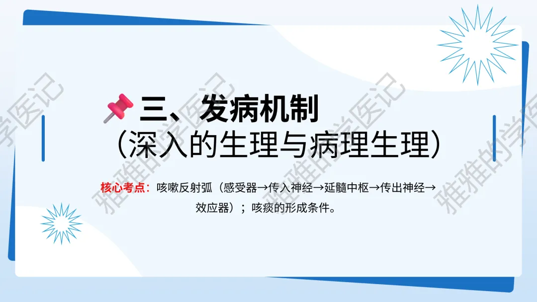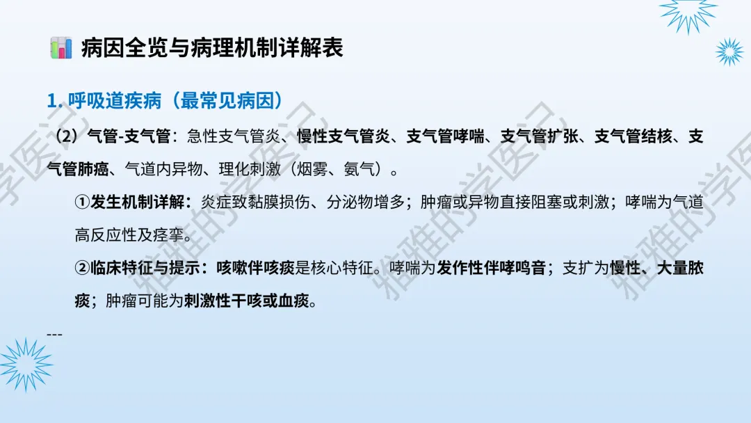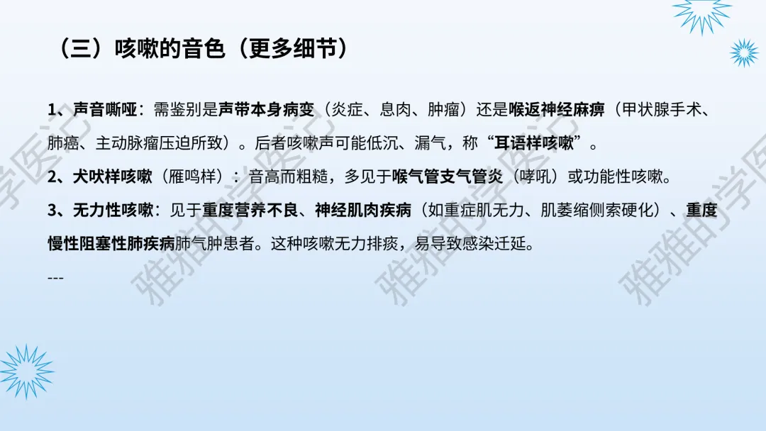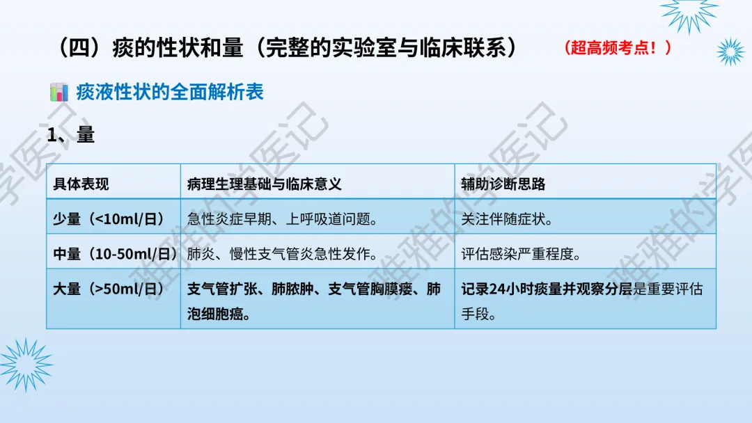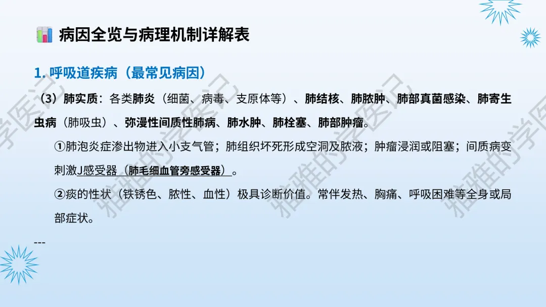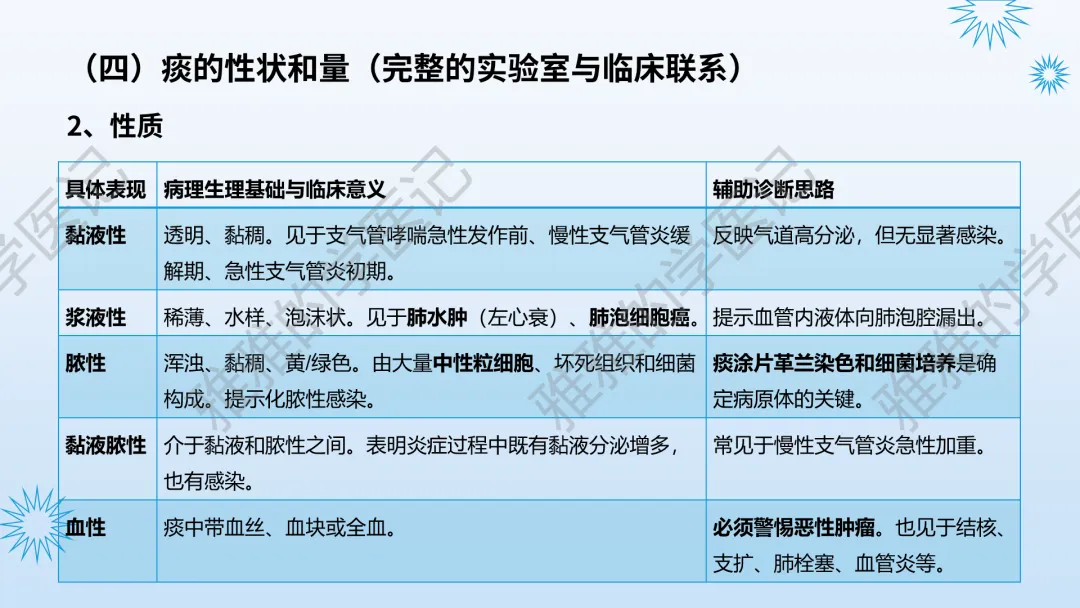 本PPT内容引用自《内科学(人卫第9、10版)》等权威文献,PPT版权归本公众号所有,制作与审稿均由本公众号完成。关注公众号为“雅雅的学医记”,获取更多专业健康知识。这份PPT凝聚了专业知识与临床经验,对咳嗽与咳痰具有认识,并了解学习的意义,欢迎大家分享转发,共同学习,期待与大家的互动!目前学识有限,欢迎大家的指正。内容说明:咳嗽与咳痰,制作完成,目前正在更新,需要笔记版请联系雅雅(免费)。后续更新内容:肺炎支原体肺炎、衣原体肺炎与肺军团病。- 知识点,需要不断积累,并梳理整理为自己的。加油!书山有路勤为径,学海无涯苦作舟。(韩愈)