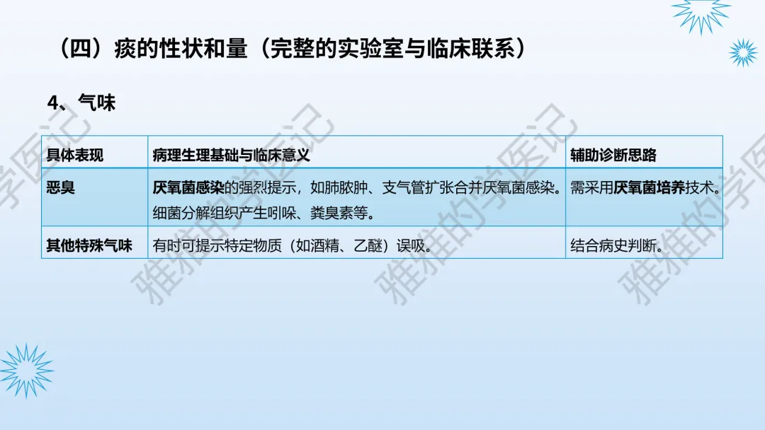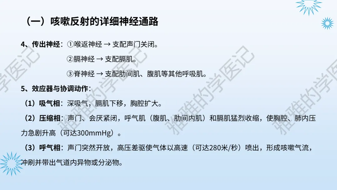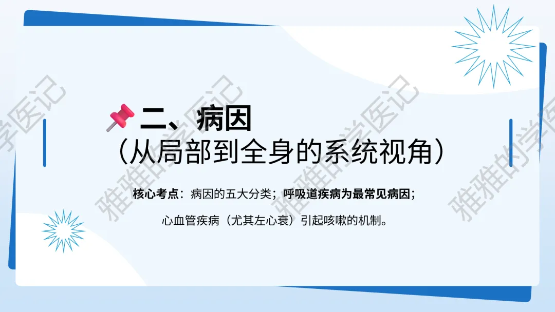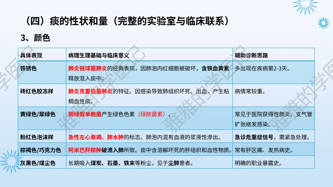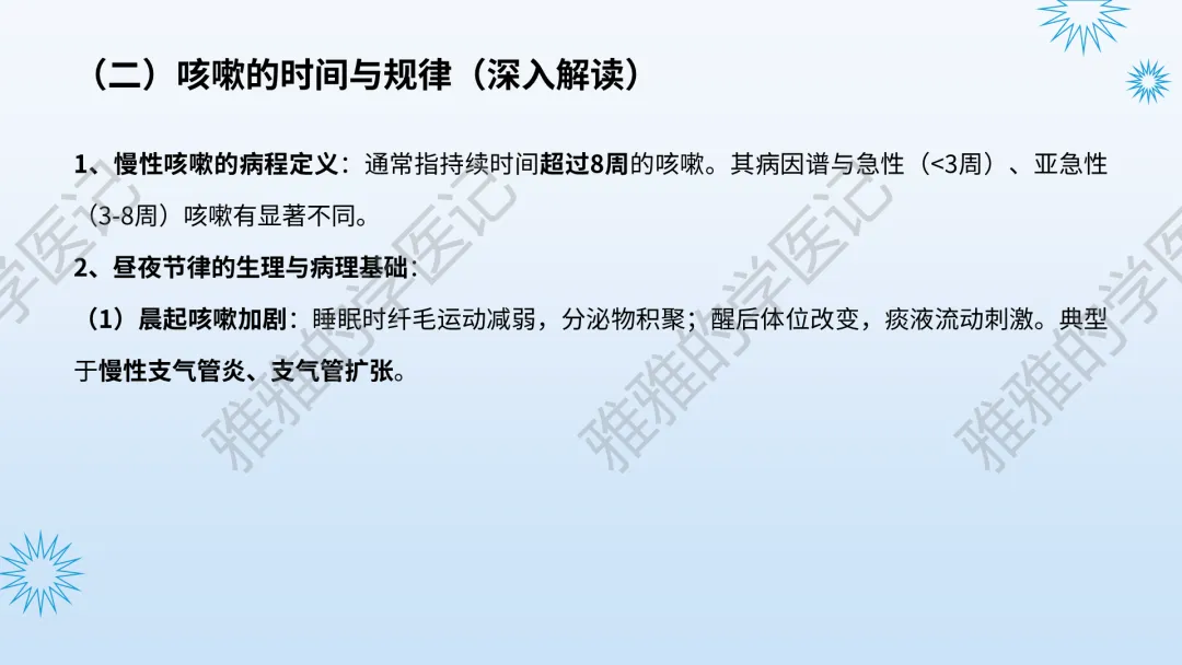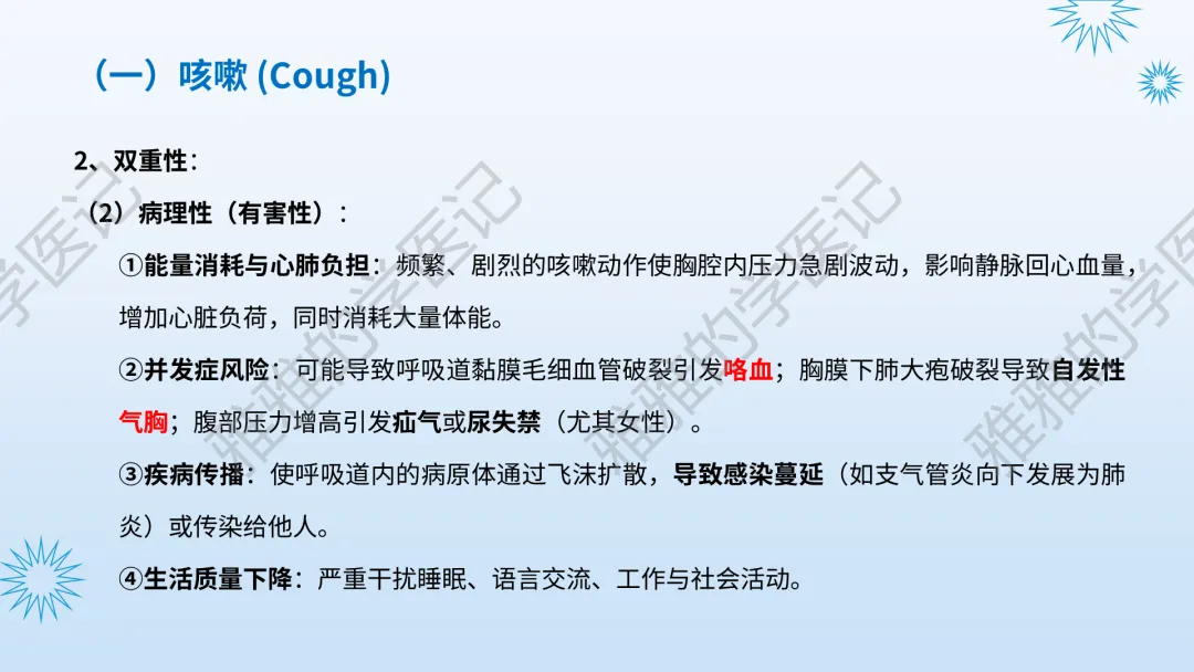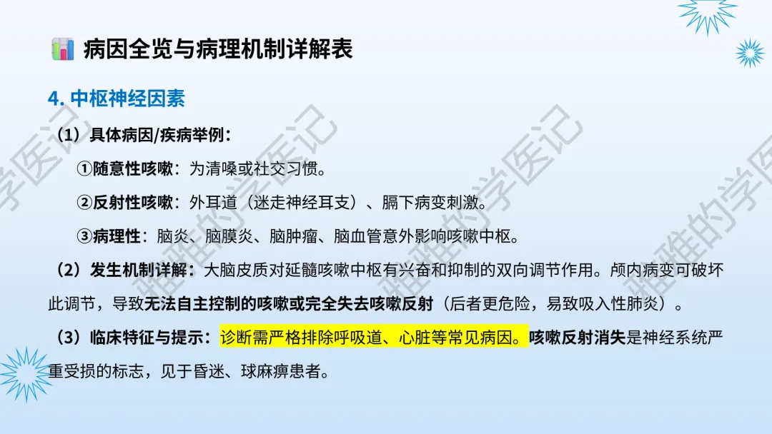 本PPT内容引用自《内科学(人卫第9、10版)》等权威文献,PPT版权归本公众号所有,制作与审稿均由本公众号完成。关注公众号为“雅雅的学医记”,获取更多专业健康知识。这份PPT凝聚了专业知识与临床经验,对咳嗽与咳痰具有认识,并了解学习的意义,欢迎大家分享转发,共同学习,期待与大家的互动!目前学识有限,欢迎大家的指正。内容说明:咳嗽与咳痰,制作完成,目前正在更新,需要笔记版请联系雅雅(免费)。后续更新内容:肺炎支原体肺炎、衣原体肺炎与肺军团病。- 知识点,需要不断积累,并梳理整理为自己的。加油!书山有路勤为径,学海无涯苦作舟。(韩愈)