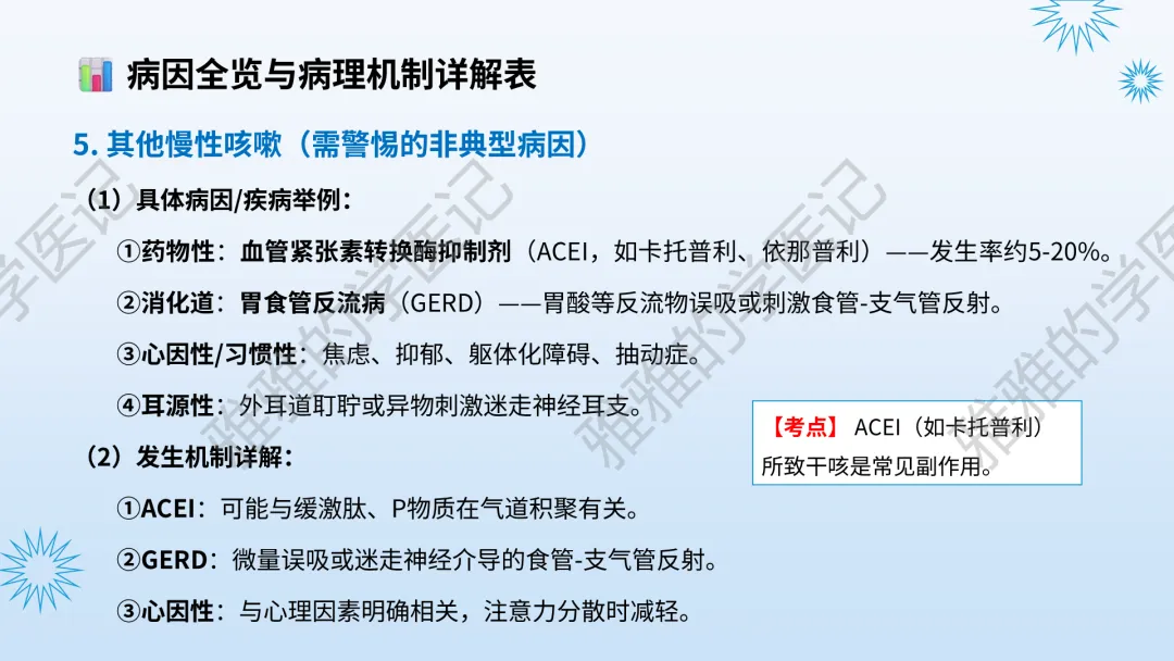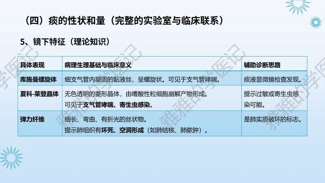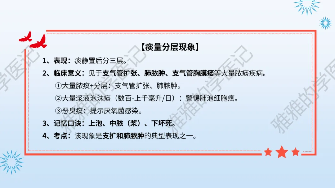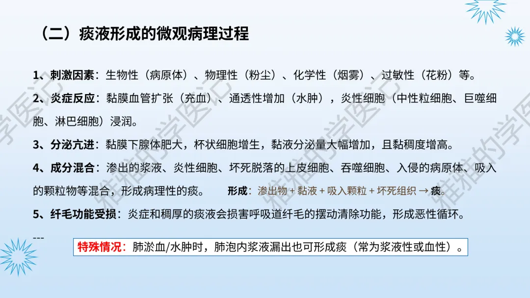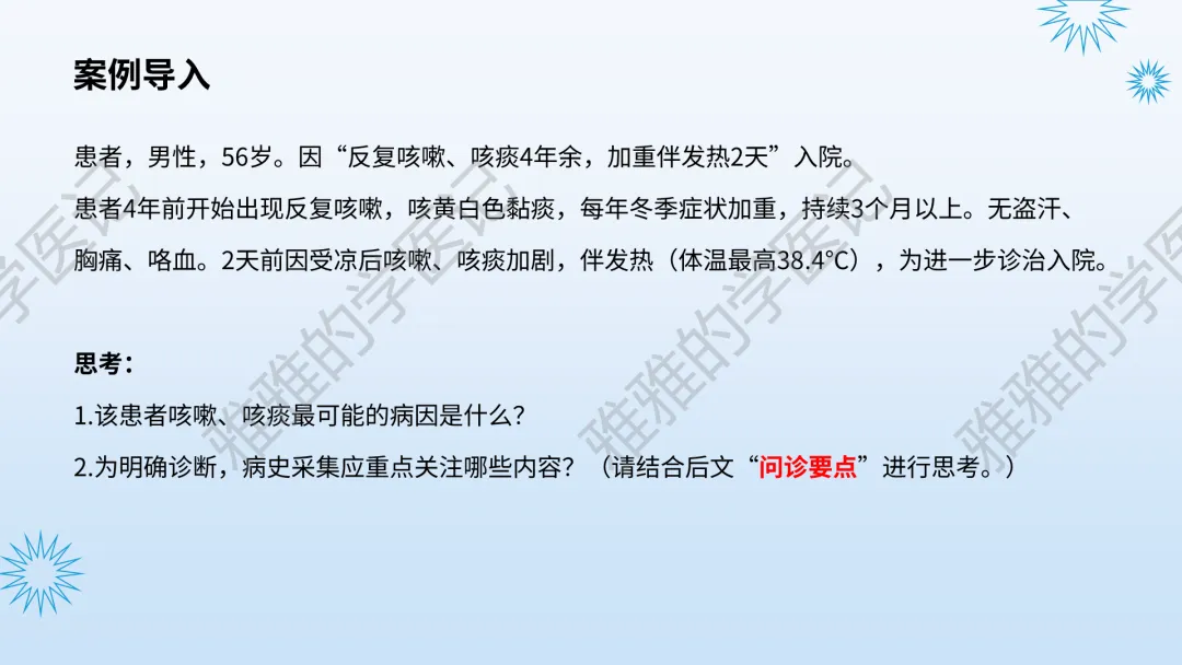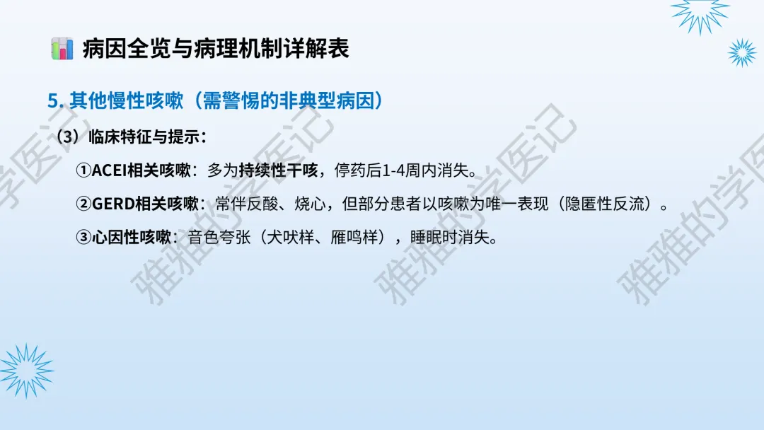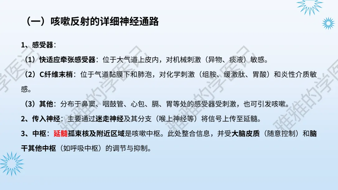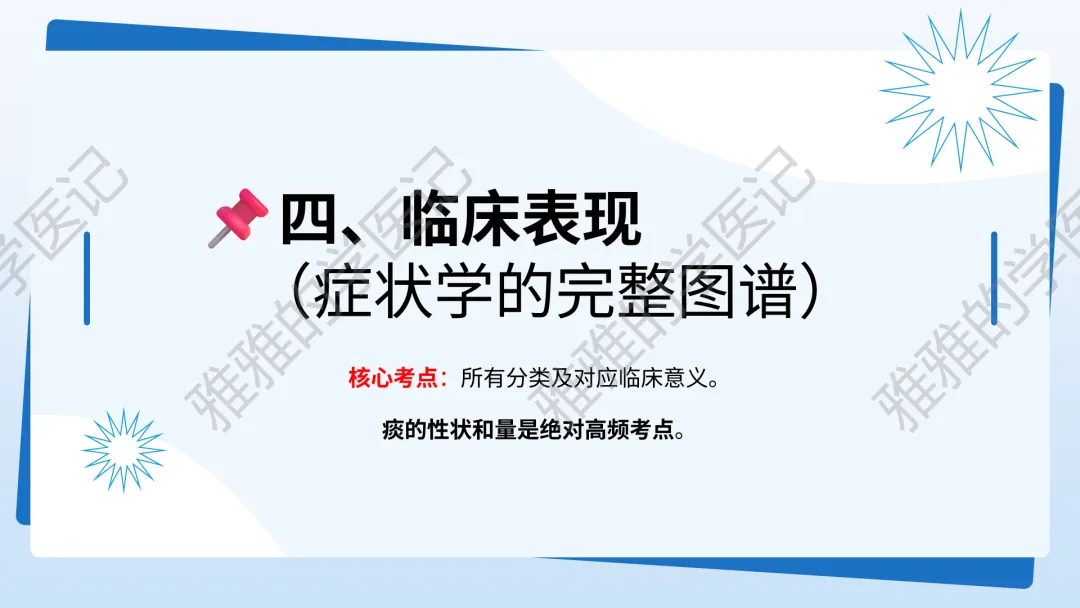 本PPT内容引用自《内科学(人卫第9、10版)》等权威文献,PPT版权归本公众号所有,制作与审稿均由本公众号完成。关注公众号为“雅雅的学医记”,获取更多专业健康知识。这份PPT凝聚了专业知识与临床经验,对咳嗽与咳痰具有认识,并了解学习的意义,欢迎大家分享转发,共同学习,期待与大家的互动!目前学识有限,欢迎大家的指正。内容说明:咳嗽与咳痰,制作完成,目前正在更新,需要笔记版请联系雅雅(免费)。后续更新内容:肺炎支原体肺炎、衣原体肺炎与肺军团病。- 知识点,需要不断积累,并梳理整理为自己的。加油!书山有路勤为径,学海无涯苦作舟。(韩愈)