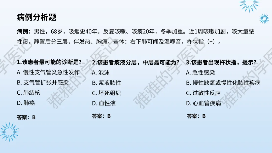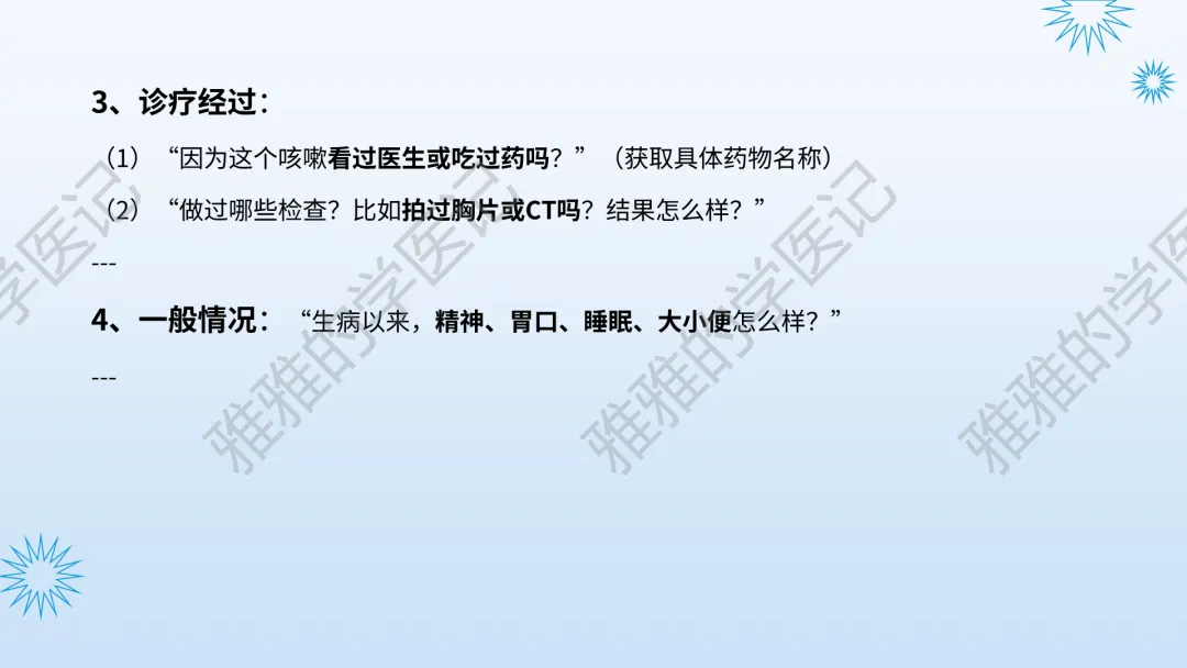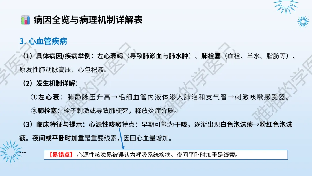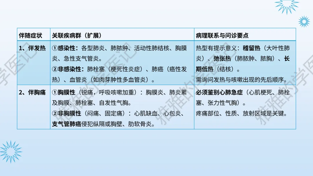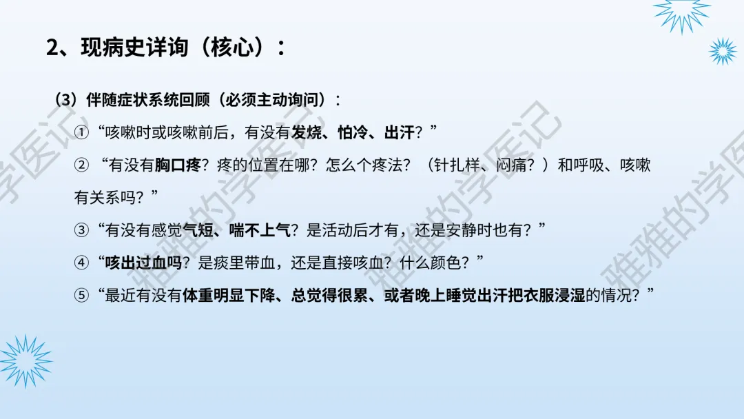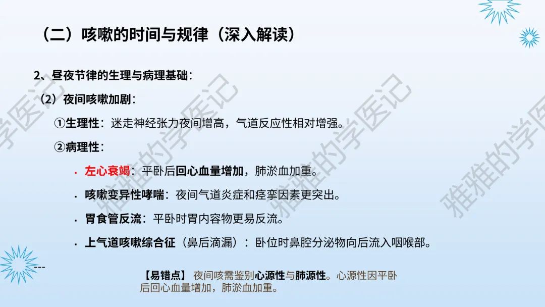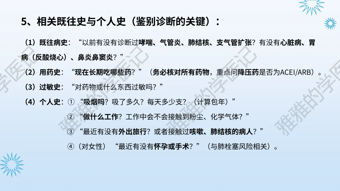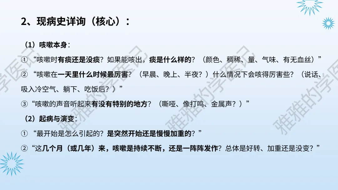 本PPT内容引用自《内科学(人卫第9、10版)》等权威文献,PPT版权归本公众号所有,制作与审稿均由本公众号完成。关注公众号为“雅雅的学医记”,获取更多专业健康知识。这份PPT凝聚了专业知识与临床经验,对咳嗽与咳痰具有认识,并了解学习的意义,欢迎大家分享转发,共同学习,期待与大家的互动!目前学识有限,欢迎大家的指正。内容说明:咳嗽与咳痰,制作完成,目前正在更新,需要笔记版请联系雅雅(免费)。后续更新内容:肺炎支原体肺炎、衣原体肺炎与肺军团病。- 知识点,需要不断积累,并梳理整理为自己的。加油!书山有路勤为径,学海无涯苦作舟。(韩愈)