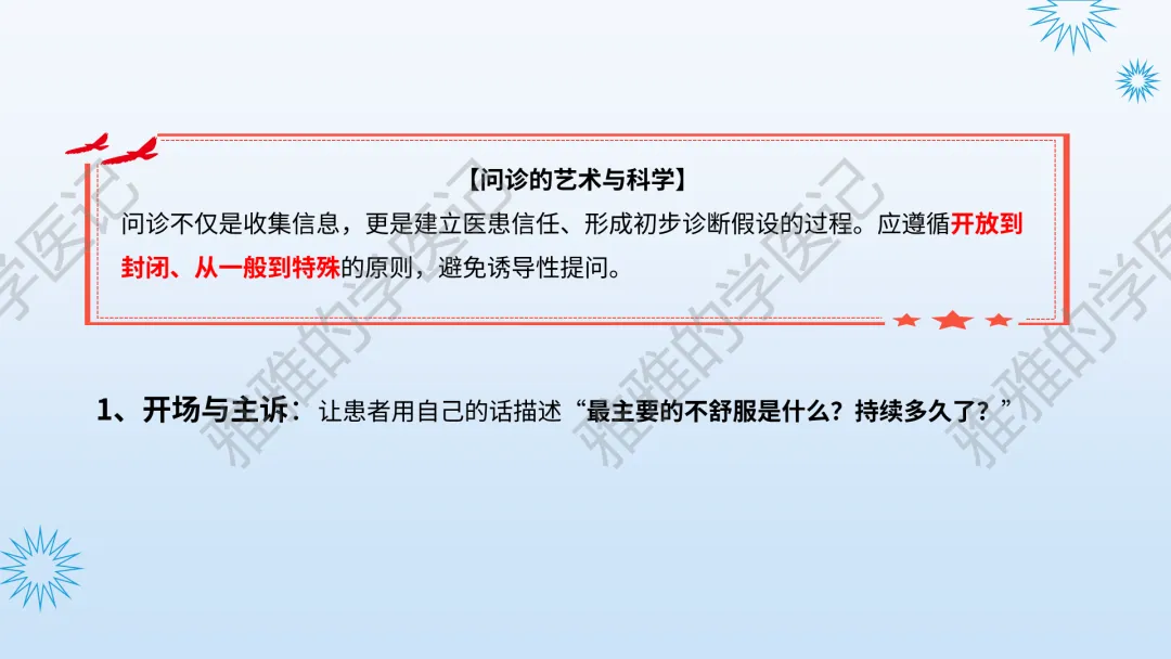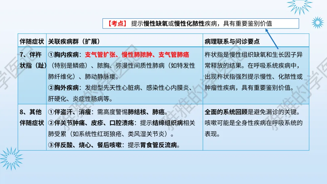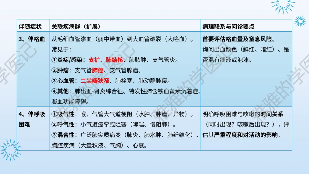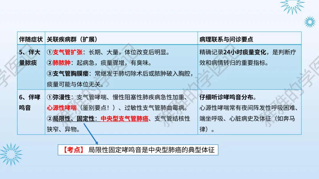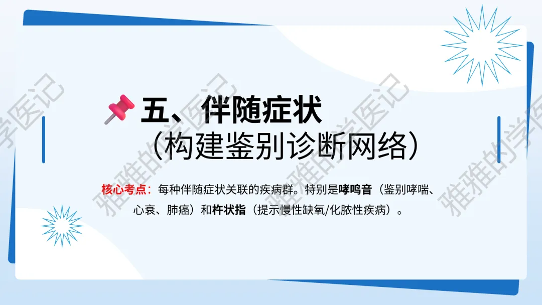 关注公众号,发送关键词“咳嗽与咳痰”获取信息!本次内容为:诊断学(第10版),第1篇-常见症状,第4节-咳嗽与咳痰。本PPT由本公众号精心制作,全面深入地了解咳嗽与咳痰这一重要议题。旨在与大家一同探讨学习,助力提升对常见症状的认知与实践水平。本演示文稿仅供教育和信息分享,不构成医疗建议。使用时请结合临床指南、专家共识及患者病情综合评估,医疗决策需咨询专业人员并参考最新研究成果。制作者和发布者对使用后果不承担责任,使用信息应遵循专业医疗实践规范,保障患者安全。