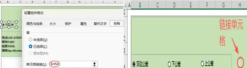 插入“开发工具”表单控件,表单控件链接一个空白单元格(如上图中的空白单元格H4),便于后续操作;