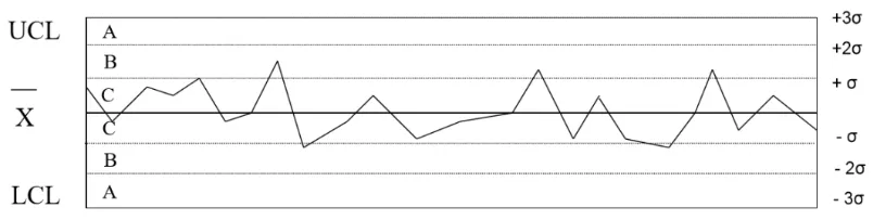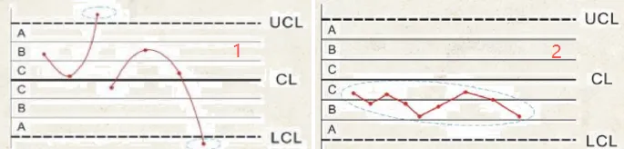 连续3个点中有2个点落在中心线同一侧的B区以外