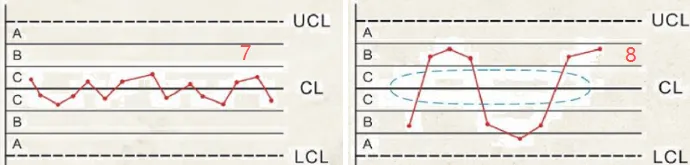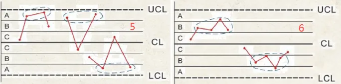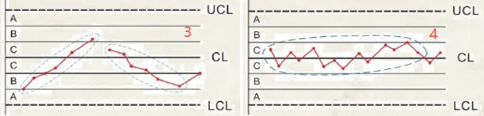 连续5个点中有4个点落在中心线同一侧的C区以外