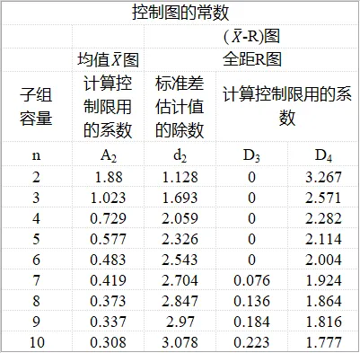 标准差系数(d2)、极差图系数(D3/D4)、均值图系数(A2)见下图,子组容量不同,所选用的系数也不同
