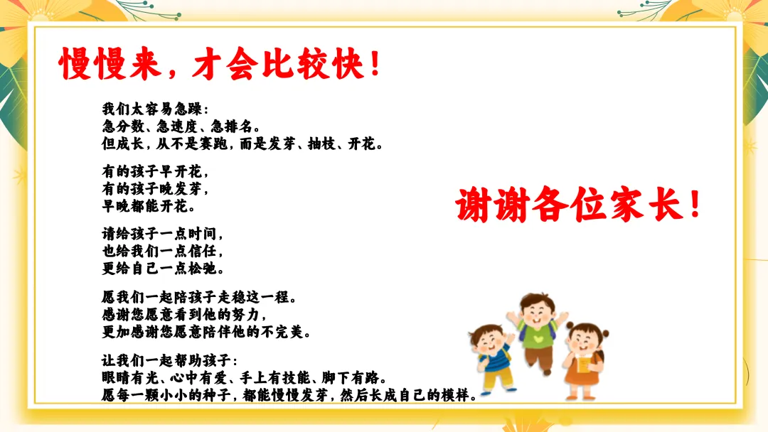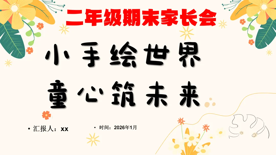 很高兴在这与您相遇,如果您是一位班主任老师,每天除了应对繁重的教学工作,还要加班整理班级、教务、教研、课件PPT资料,请关注下方的“小雨教务资料”,让我们风雨同路、一起成长~今天分享的是二年级上期末家长会的ppt和配套的发言稿,主题是《小手绘世界,童心筑未来》。二年级上期末家长会逐字发言稿