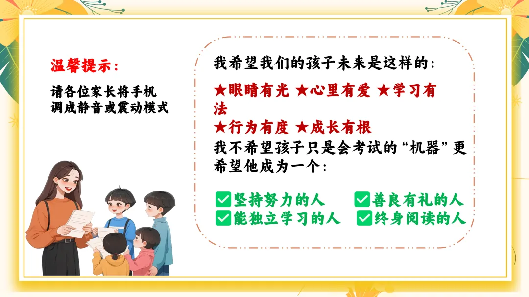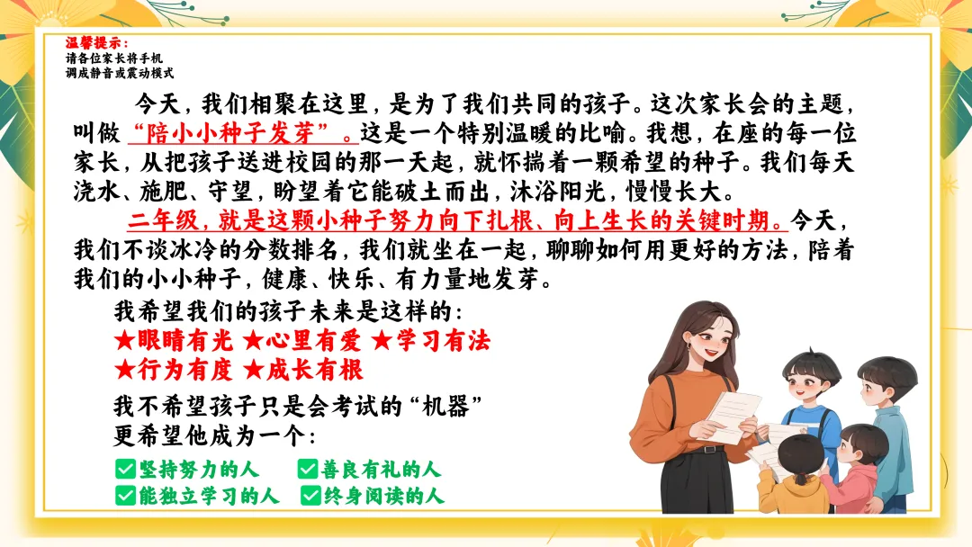 今天,我们相聚在这里,是为了我们共同的孩子。这次家长会的主题,叫做“小手绘世界,童心筑未来”。这是一个特别温暖的主题,它代表着我们对孩子们未来的美好期许。
