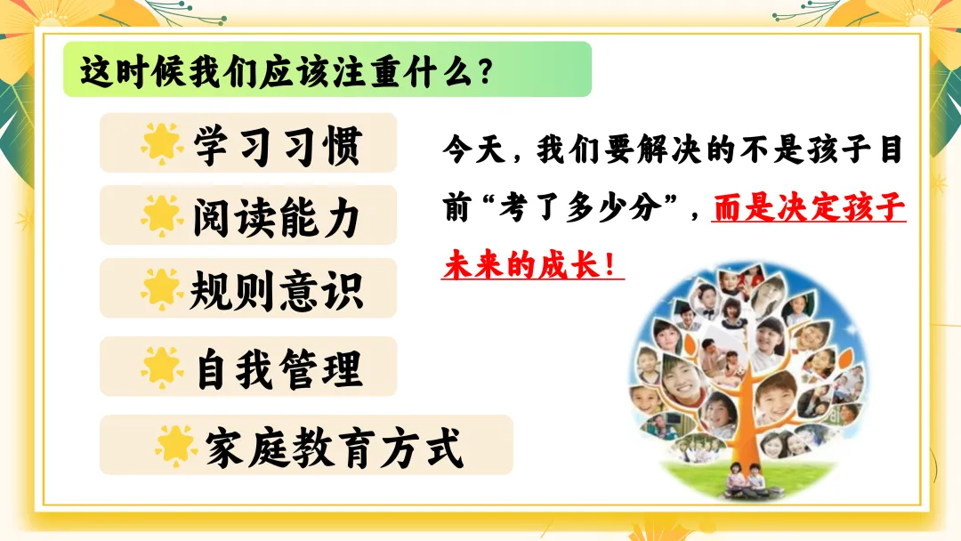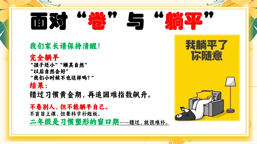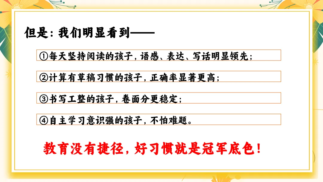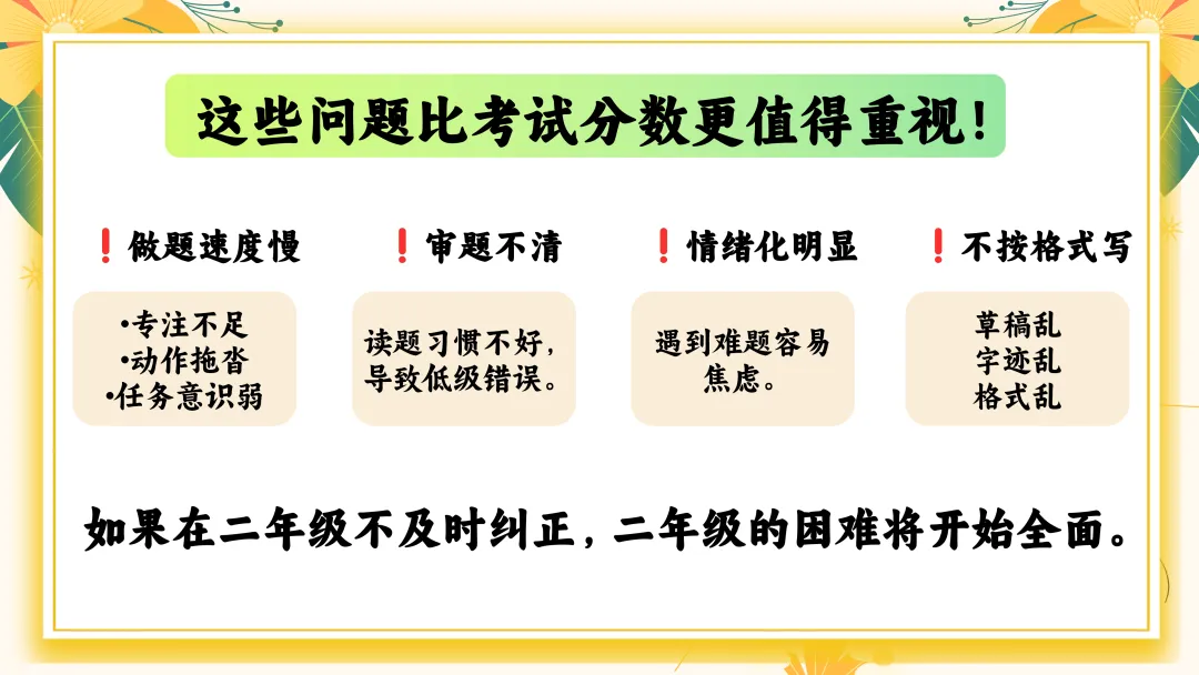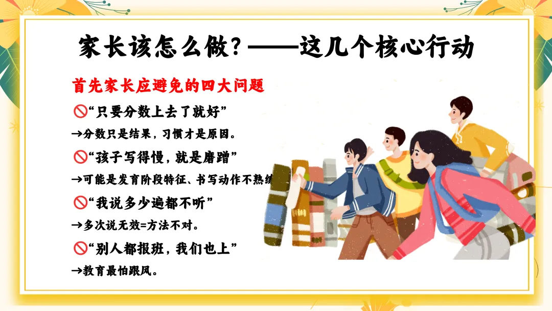 首先家长应避免的四大问题: 1. “只要分数上去了就好” →分数只是结果,习惯才是原因。 2. “孩子写得慢,就是磨蹭” →可能是发育阶段特征、书写动作不熟练。 3. “我说多少遍都不听” →多次说无效=方法不对。 4. “别人都报班,我们也上” →教育最怕跟风。
