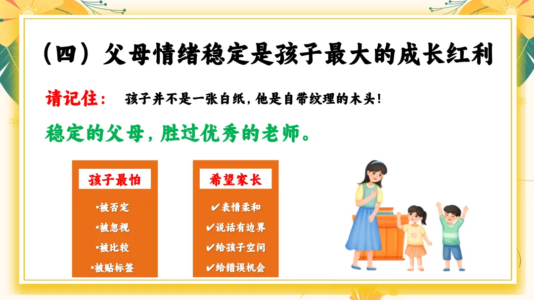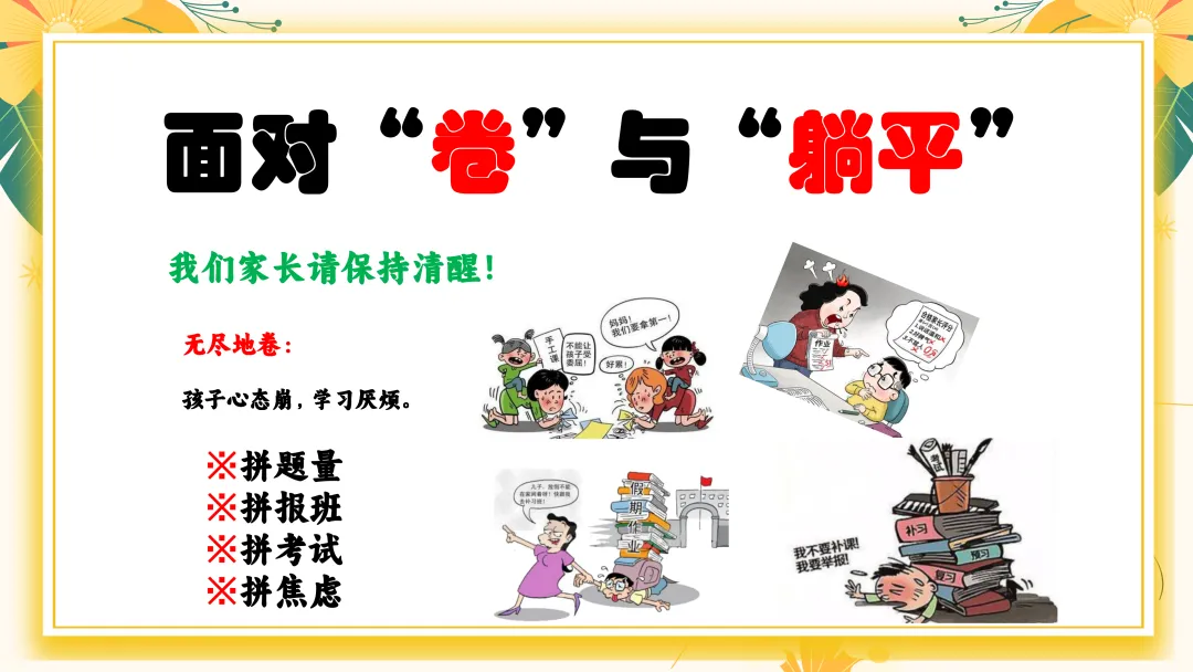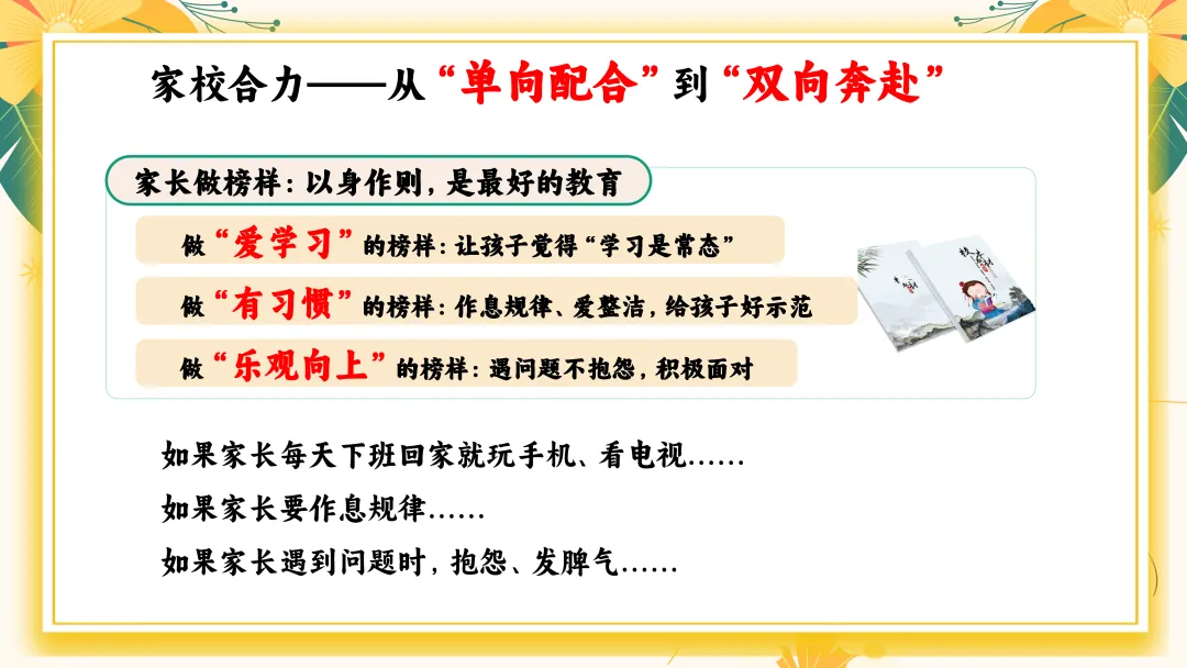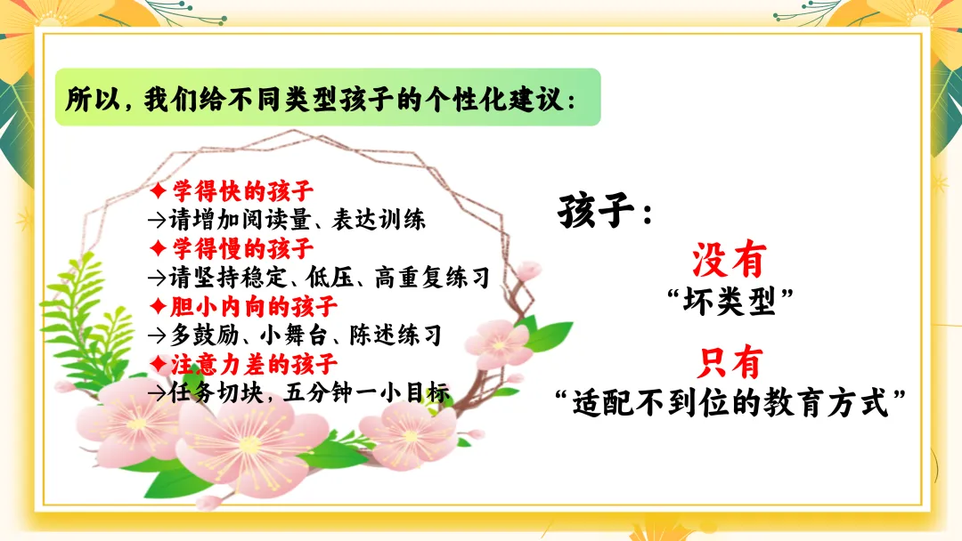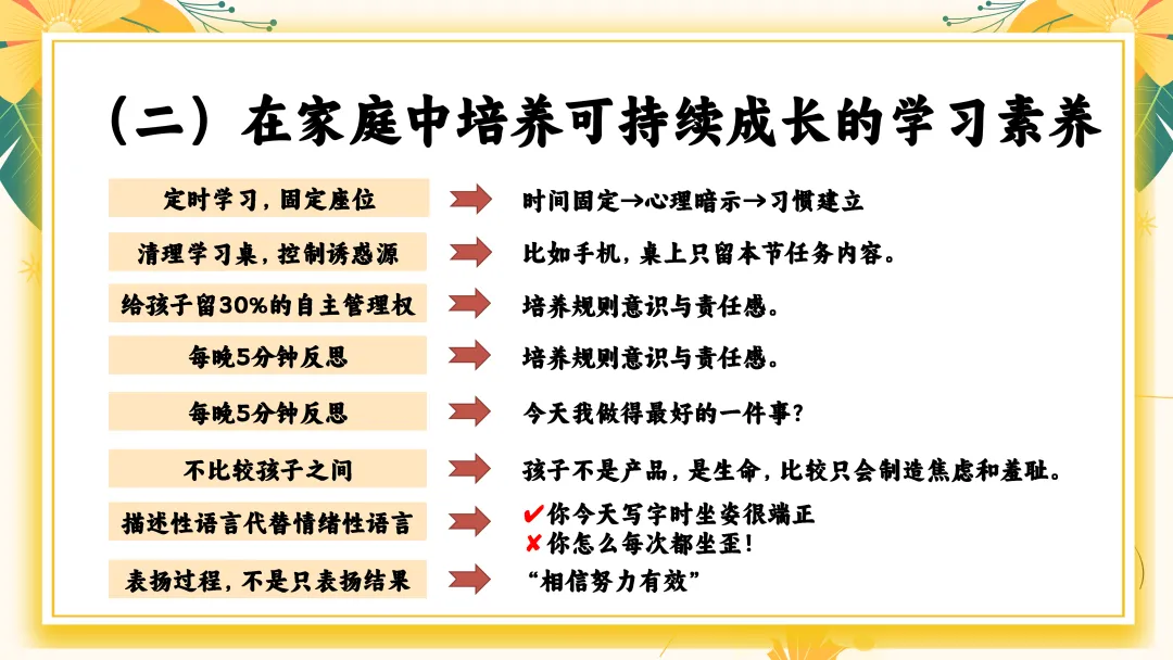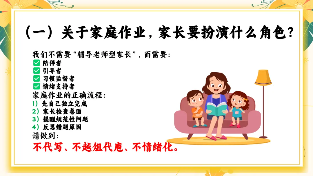 首先家长应避免的四大问题: 1. “只要分数上去了就好” →分数只是结果,习惯才是原因。 2. “孩子写得慢,就是磨蹭” →可能是发育阶段特征、书写动作不熟练。 3. “我说多少遍都不听” →多次说无效=方法不对。 4. “别人都报班,我们也上” →教育最怕跟风。