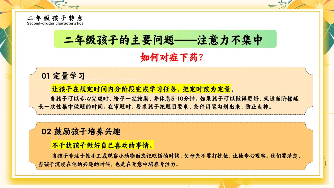 01 定量学习让孩子在规定时间内分阶段完成学习任务,把定时改为定量。当孩子可以专心完成时,给予一定鼓励,并休息5-10分钟。如果孩子可以做得更好,就适当阶梯延长一次性集中做题的时间。在审题时,要求孩子把题目要求、条件用笔勾划出来,防止走神。