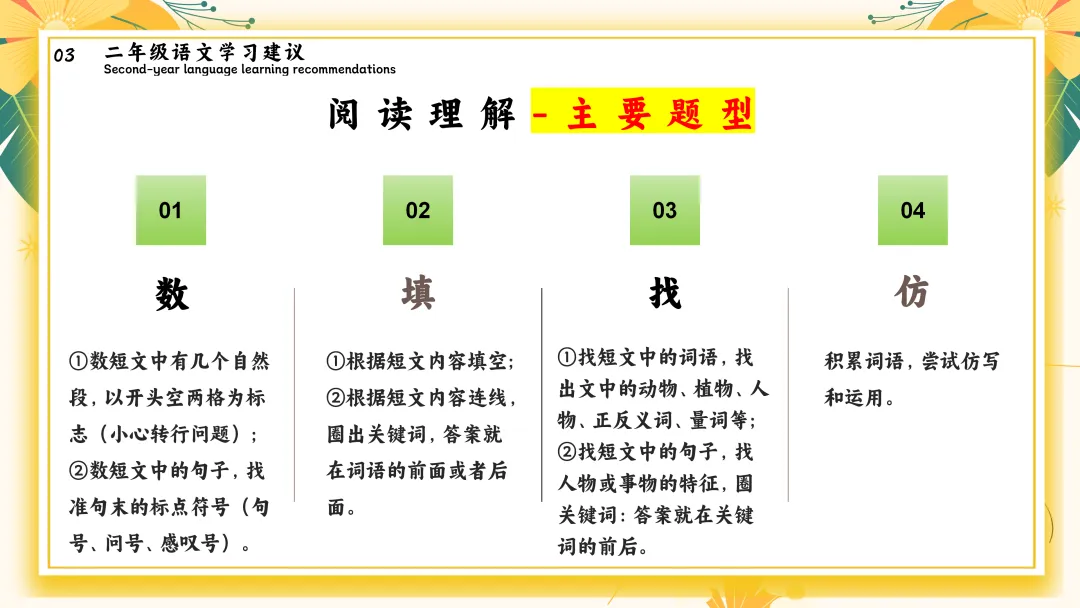 (1)语文方面 - 字词基础不稳 - 读题不全、审题习惯差 - 阅读时只看字面,不能理解隐含信息 - 写话内容空泛、不够具体