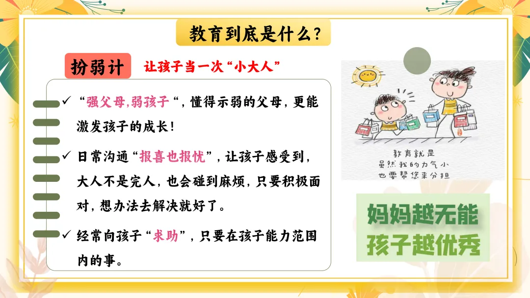 1. 让孩子当一次“小大人”懂得示弱的父母,更能激发孩子的成长!日常沟通中,让孩子感受到,大人不是完人,也会碰到麻烦,只要积极面对,想办法去解决就好了。经常向孩子“求助”,只要在孩子能力范围内的事。