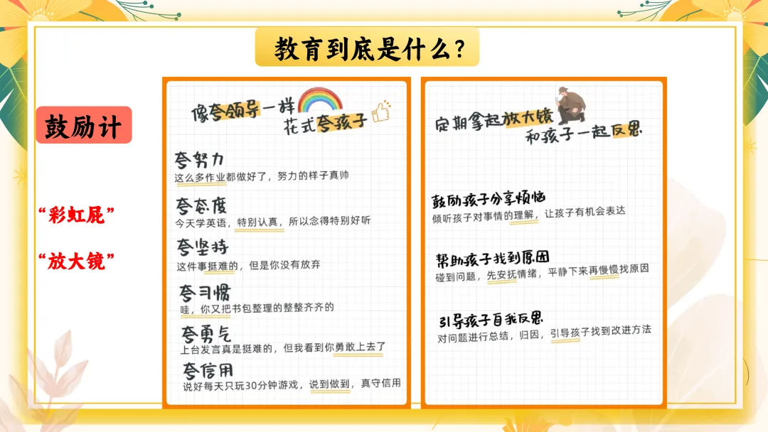 2. 每个孩子都需要“彩虹屁”和“放大镜”鼓励是最好的教育方式,我们要学会用“彩虹屁”和“放大镜”去发现孩子的优点和进步。