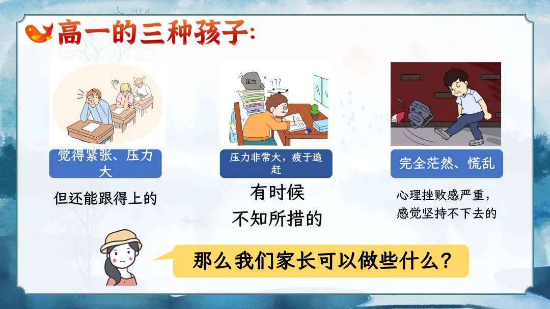 在我看来面带苦色的高一学生,要分成三大群体:觉得紧张、压力大,但还能跟得上的;压力非常大,疲于追赶,有时候不知所措的;完全茫然、慌乱,心理挫败感严重的。第三种数量不多,但问题最为严重,如果不及时疏导,就会出现各种心理问题,后果是老师、家长所无法控制的。而心理亚健康者,在高一新生中却数量庞大,班主任、家长对此要心有警惕。