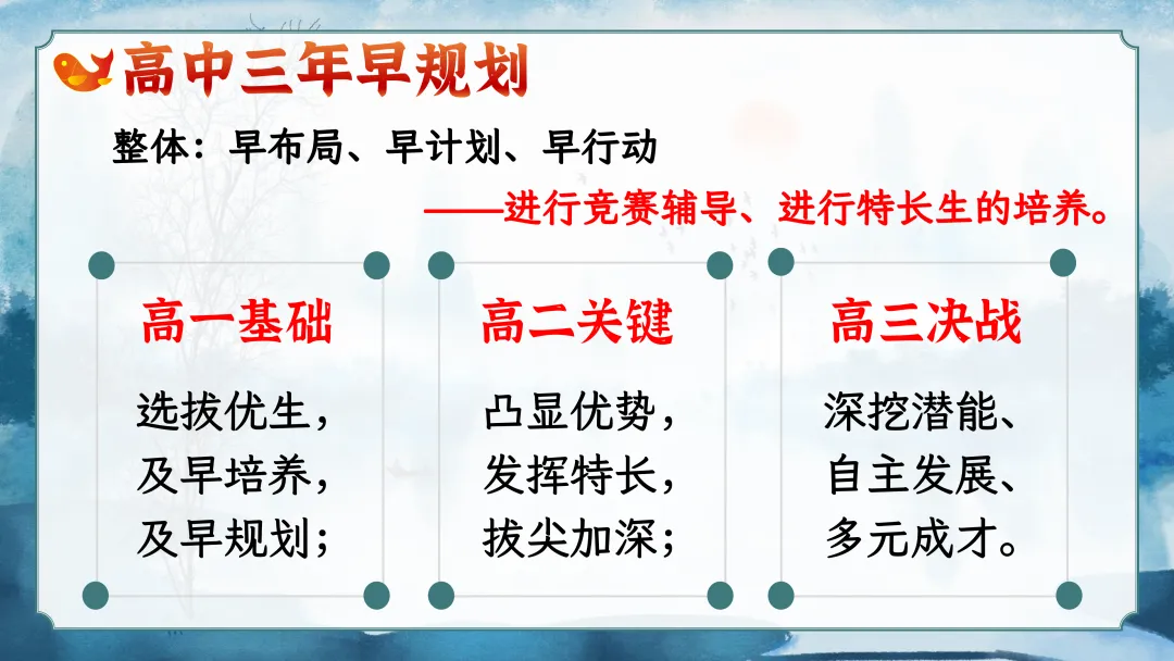 整体:早布局、早计划、早行动——进行竞赛辅导、进行特长生的培养。