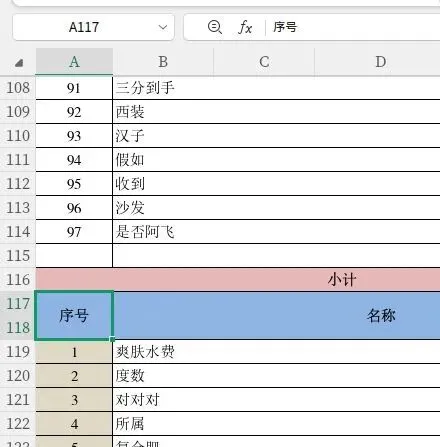看看这个典型的表格结构:前一个数据块结束后,有个“小计”行(通常用红色或粉色底色标记),然后是一个重复的表头行(蓝色底色),接着是新的数据区块。