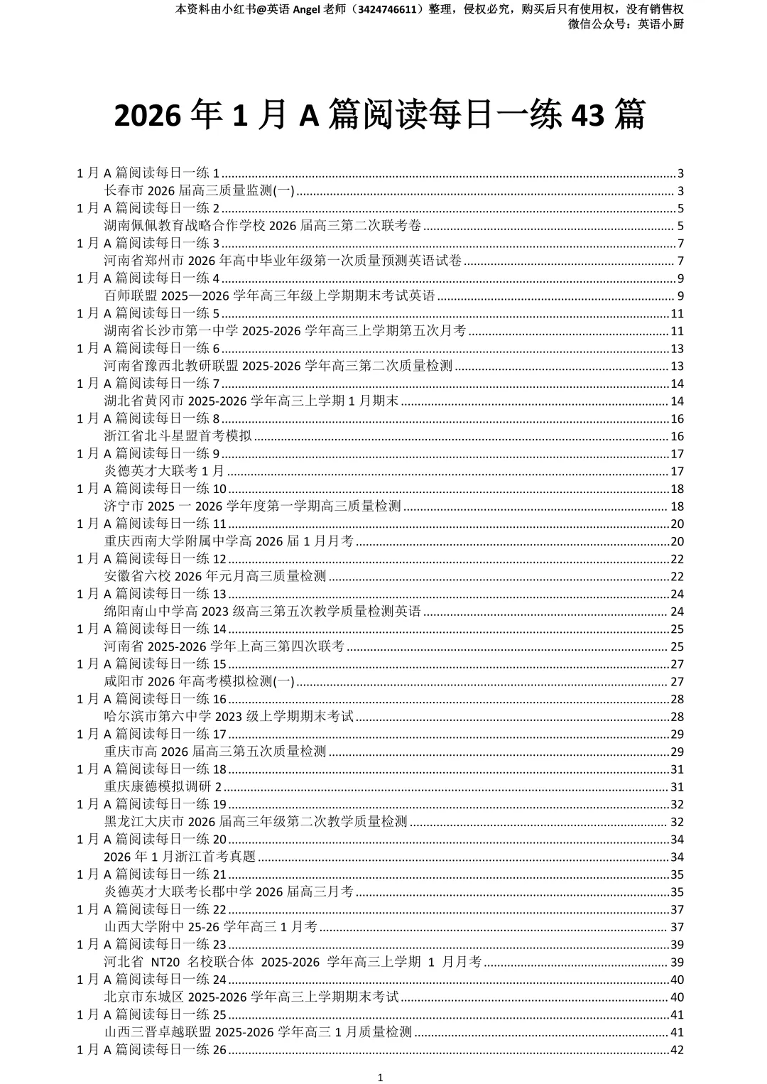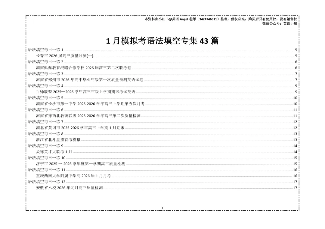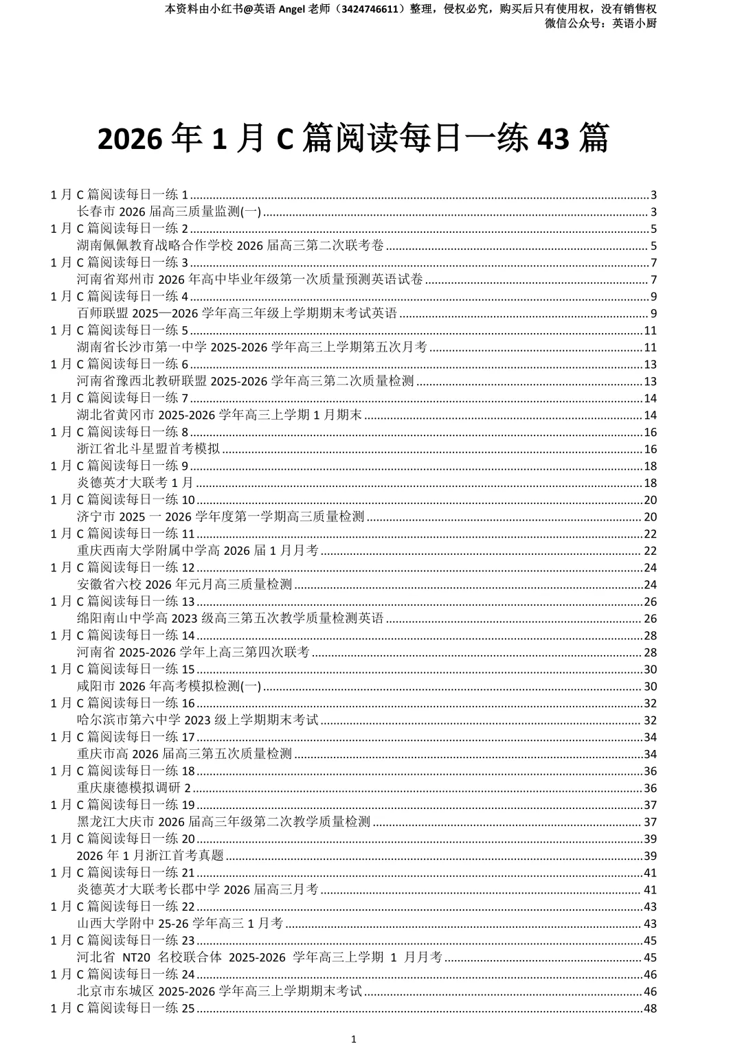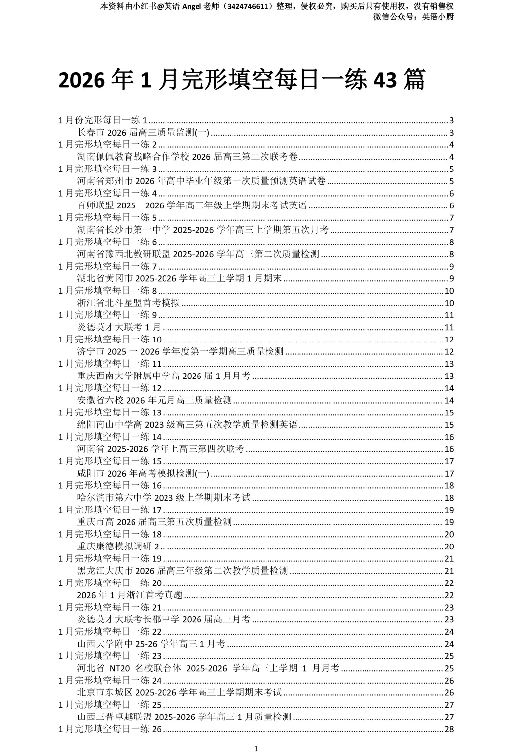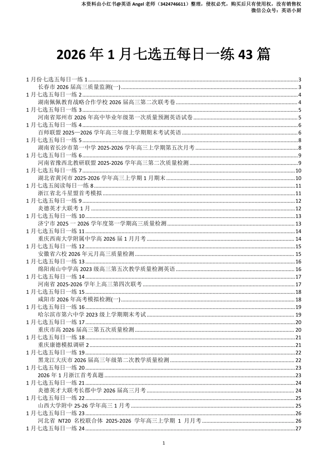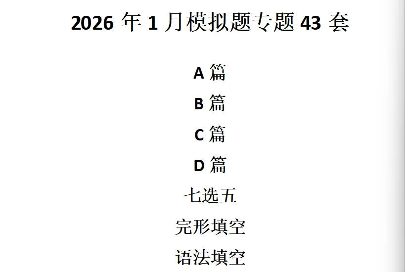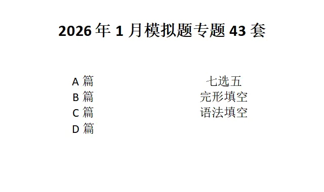 今天要和大家分享的是26年1月份模拟题专题,把每一种题型拆开进行汇总,目前整理了A、B、C、D、七选五、完形填空、语法填空。每种题型43份,阅读理解带了文章翻译与详细答案。获取方式在最后面。