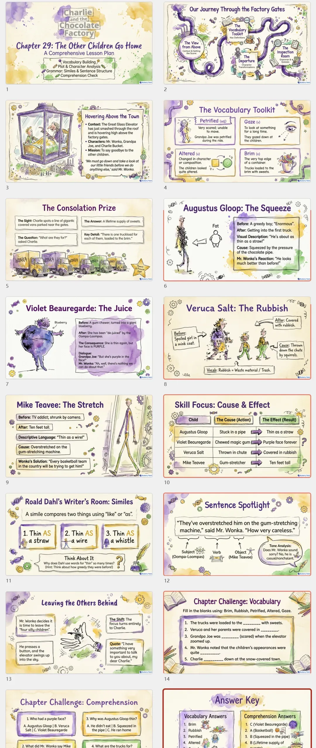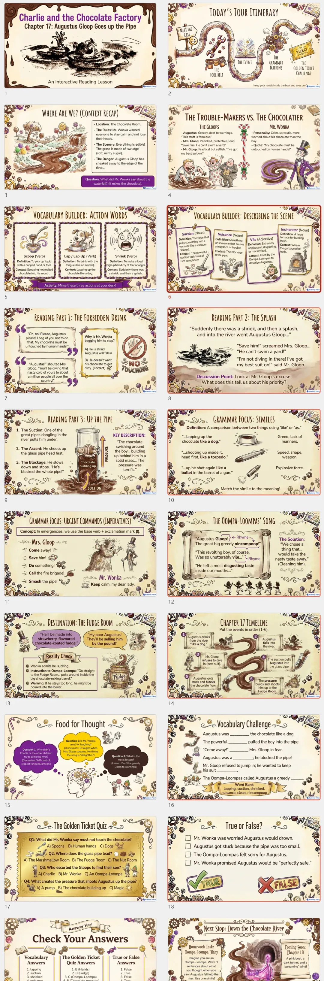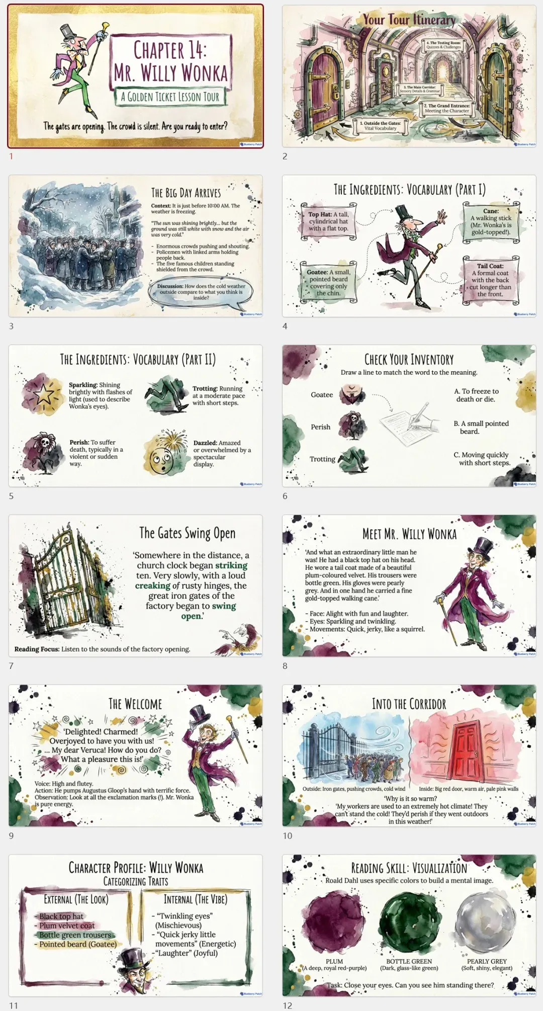 今天给大家分享一套查理巧克力工厂《Charlie and the Chocolate Factory》阅读PPT课件。超美画风,逐章精读。罗尔德·达尔的 《Charlie and the Chocolate Factory》几乎是每个学英语的孩子必读的经典章节书。充满了想象力的糖果世界,孩子很难不被吸引。