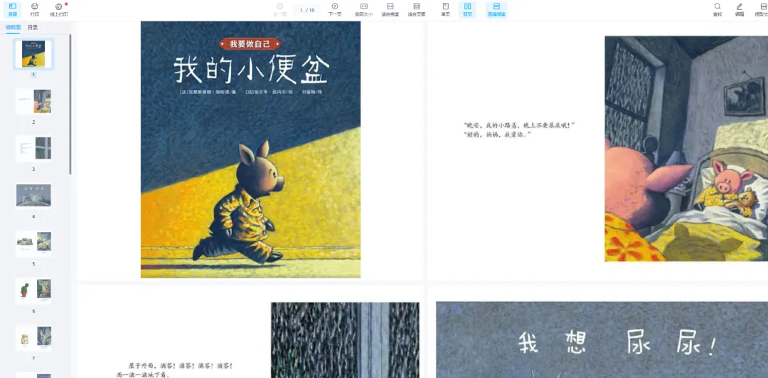 绘本阅读是幼儿教育的重要方式,但许多家长因孩子不识字或价格高而忽视其价值。实际上,绘本通过图文结合能同时刺激儿童的视觉和语言发展。优质绘本能提升儿童的认知、语言和社交能力。长期阅读对学业发展和亲子关系都有积极影响。绘本既是学习工具,也是亲子互动的桥梁。绘本PPT通过丰富多彩的故事和生动的画面,激发幼儿园儿童的学习兴趣,培养他们的阅读能力、想象力和创造力。 绘本PPT电子版画册涵盖了各种主题和风格,包括寓言故事、科普知识、生活常识、人际交往等方面,满足不同年龄段儿童的阅读需求。这些绘本不仅具有丰富的故事情节和精美的插图,还注重文字表达简洁易懂,适合幼儿园儿童阅读和理解。晚上,小路易醒了,他想要尿尿,但是他小便盆去哪儿了呢?这是一本让孩子了解夜尿、熟悉小便盆的图画书,作者用富有幽默的想象勾勒出了一个孩子对于小便盆的无限遐想。