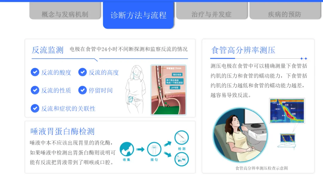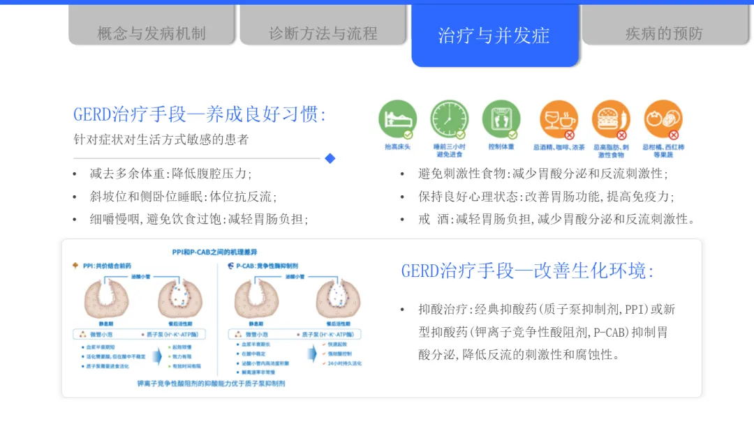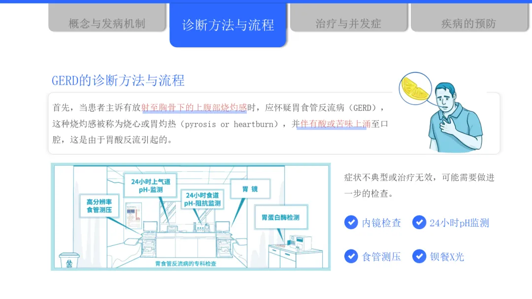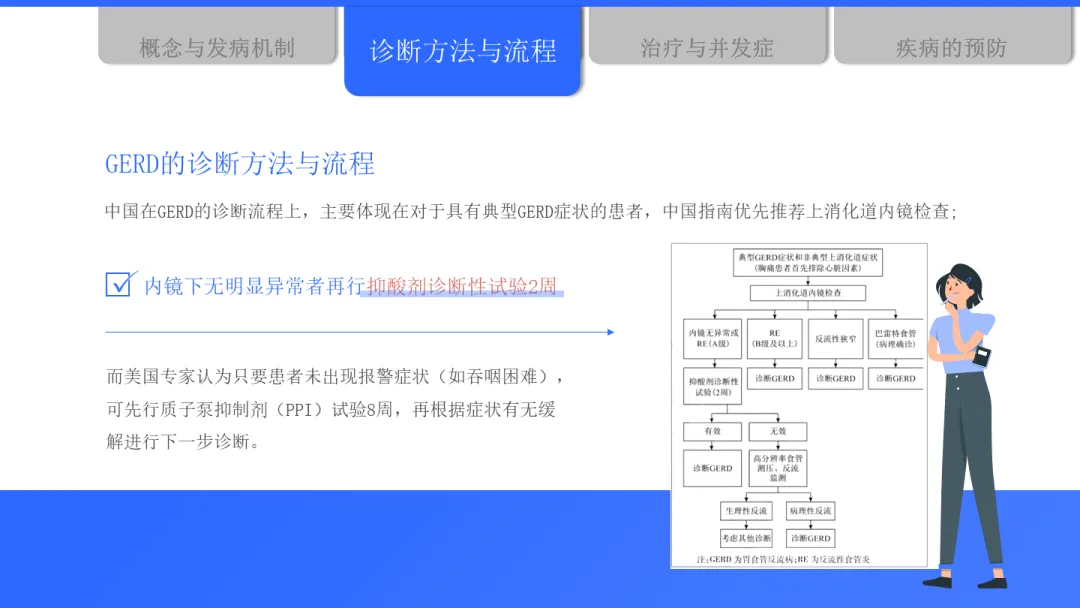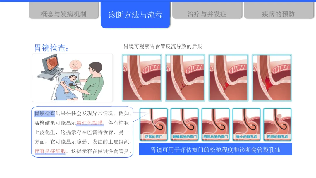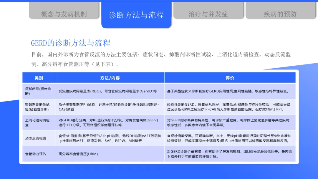 在诊断方面,目前主要有症状评估、抑酸试验、胃镜检查、反流监测等多种方法。中国指南更倾向于对典型症状患者优先进行胃镜检查,以便直观评估食管黏膜状况,及时发现如巴雷特食管等病变。