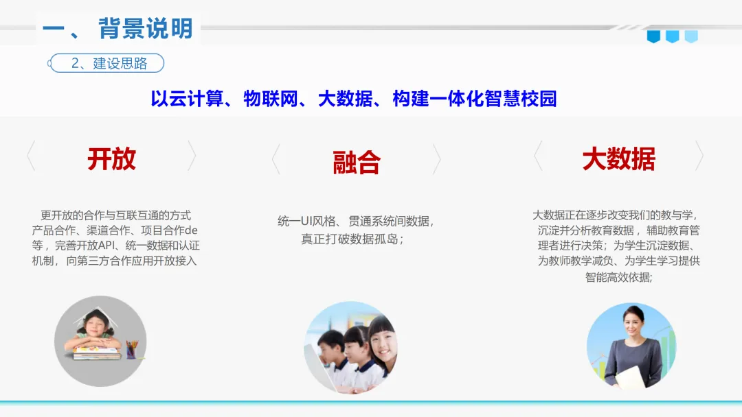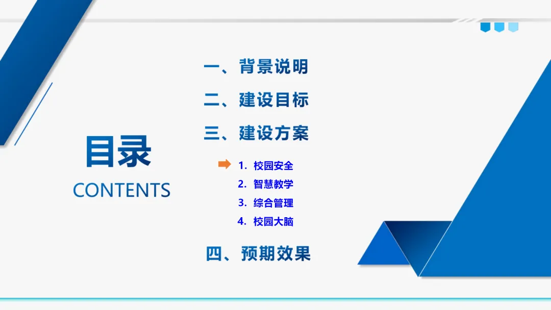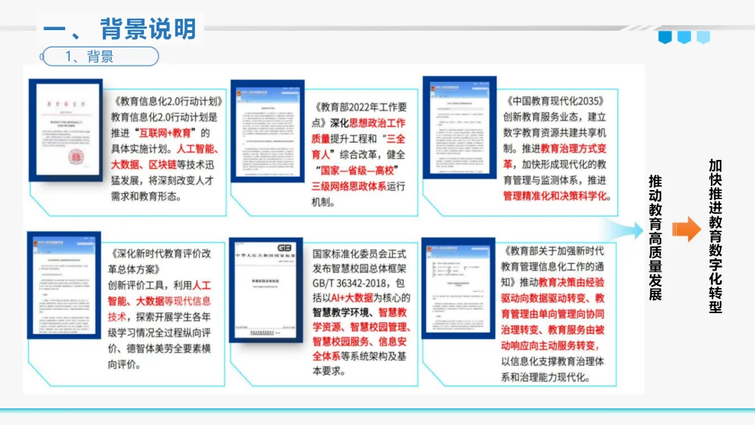 本方案紧扣教育数字化转型趋势,以《教育信息化 2.0 行动计划》等政策为遵循,围绕 “安全、教学、管理、大脑” 四大核心维度,构建了融合大数据、物联网、人工智能等技术的一体化智慧校园体系,旨在打破数据孤岛,实现教育教学与校园管理的精准化、智能化升级。