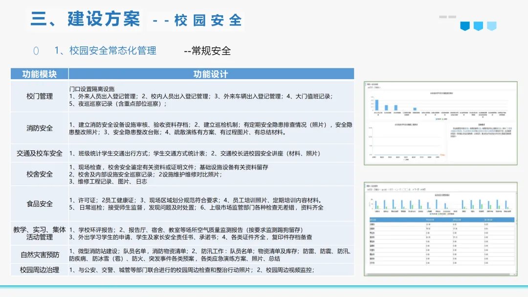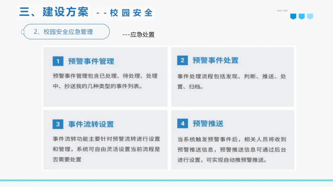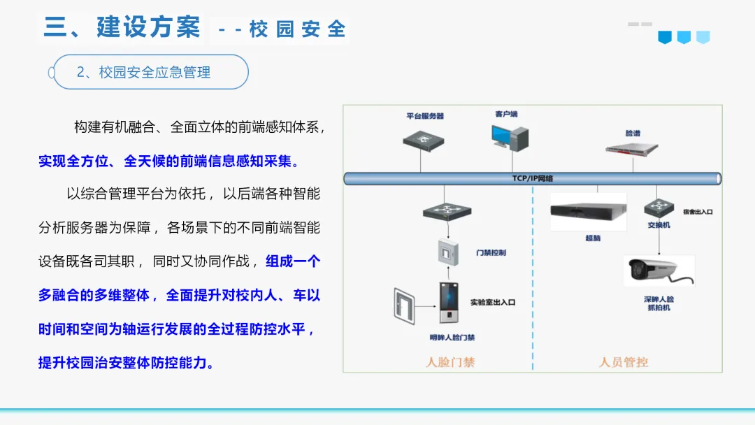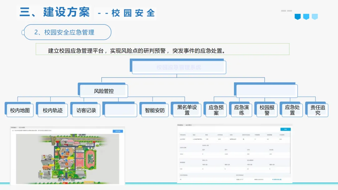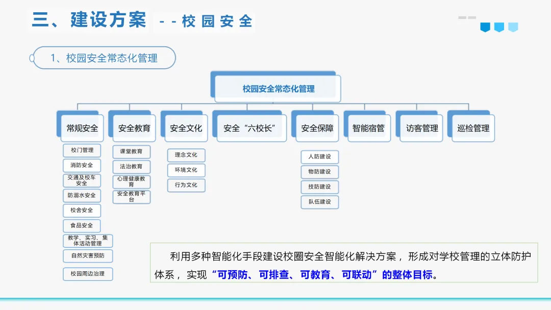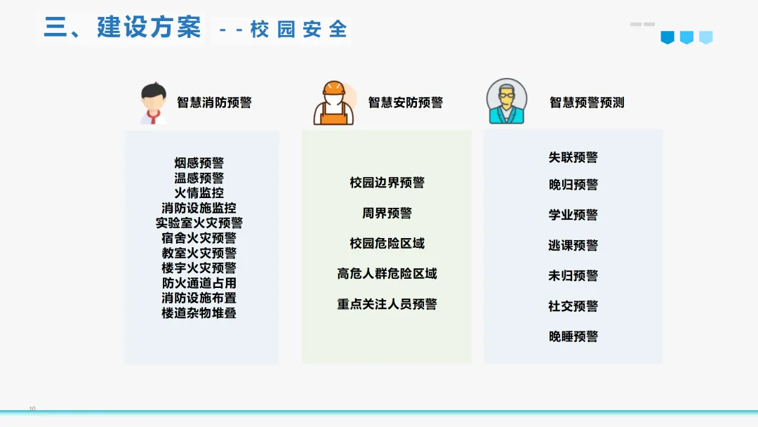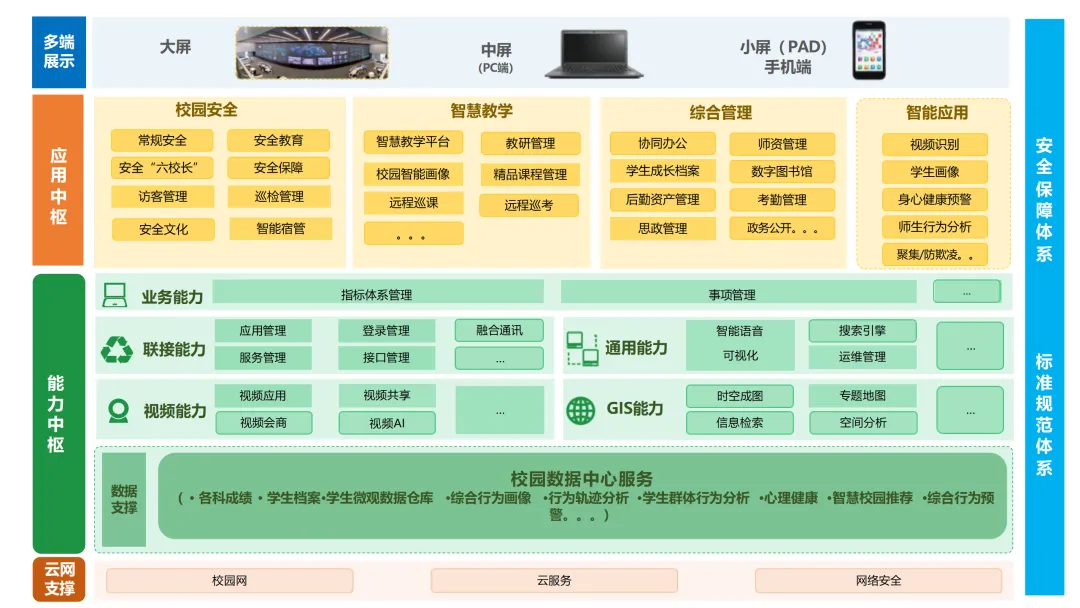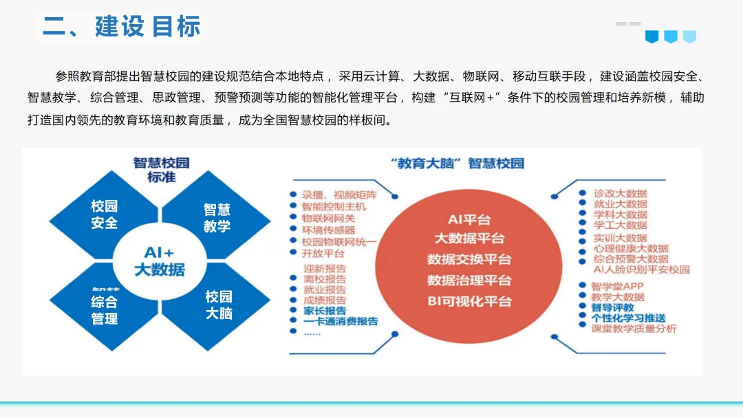 综合管理层面,整合协同办公、师资管理、学生成长档案、后勤资产管理等模块,通过分级授权与多端应用,提升校园运营效率。方案还突出思政管理与学生身心健康预警,构建 “四位一体” 心理健康工作体系,实现学业、心理、行为等多维度预警。整体方案通过 “三全两高一大” 的建设目标,推动教学应用、学习应用、数字校园建设全覆盖,助力提升师生信息素养与信息化应用水平,打造全国智慧校园示范样板。