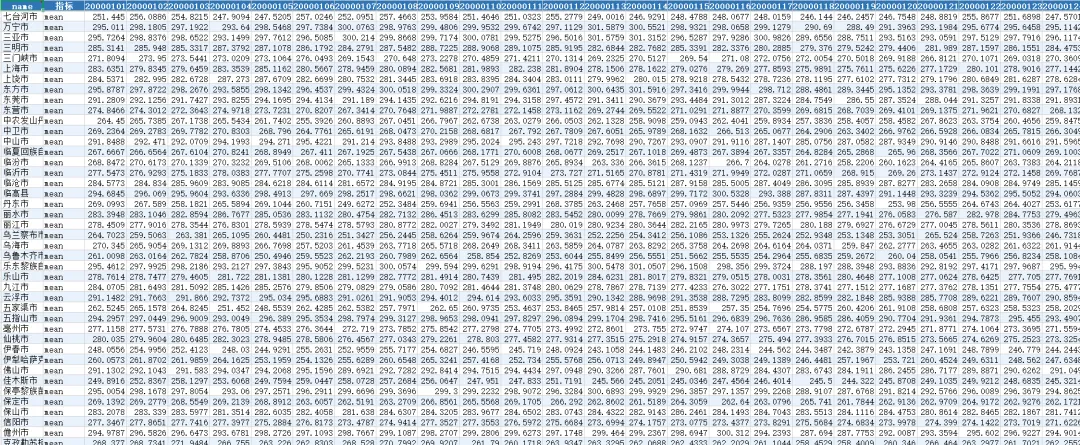 我们根据中国省市行政区划将其统计各省市的平均值,将其转为Excel格式数据,概览如下: