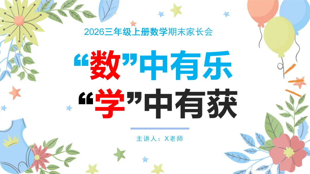 很高兴在这与您相遇,如果您是一位班主任老师,每天除了应对繁重的教学工作,还要加班整理班级、教务、教研、课件PPT资料,请关注下方的“春雨教务资料”,让我们风雨同路、一起成长~今天分享的是三年级数学期末家长会的ppt课件及配套的发言稿,主题是《数中有乐,学中有获》。【三上】【数学】【“数”中有乐“学”中有获】